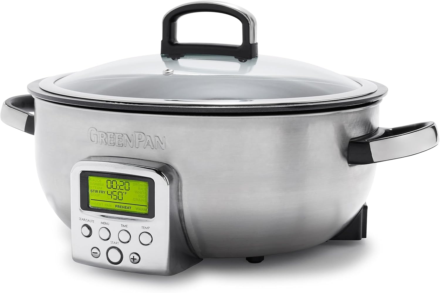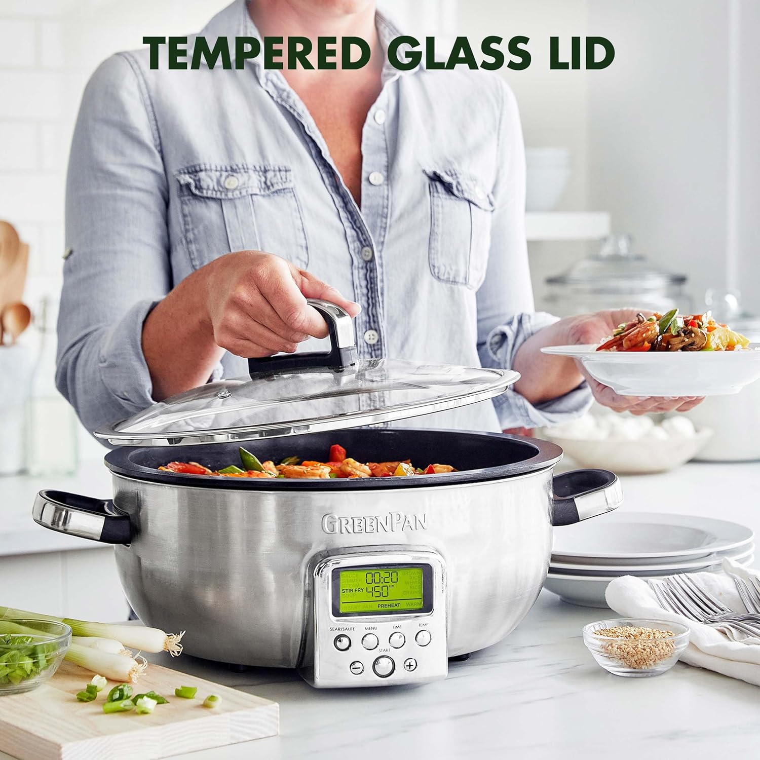 GreenPan Elite Essential Smart електрическа тенджера за задушаване с обем 5,6 л, лесно печене, смесване на сотиране и избор на режим за готвене на ориз, здравословно керамично незалепващо покритие без PFAS, части, подходящи за миене в съдомиялна машина, LED дисплей