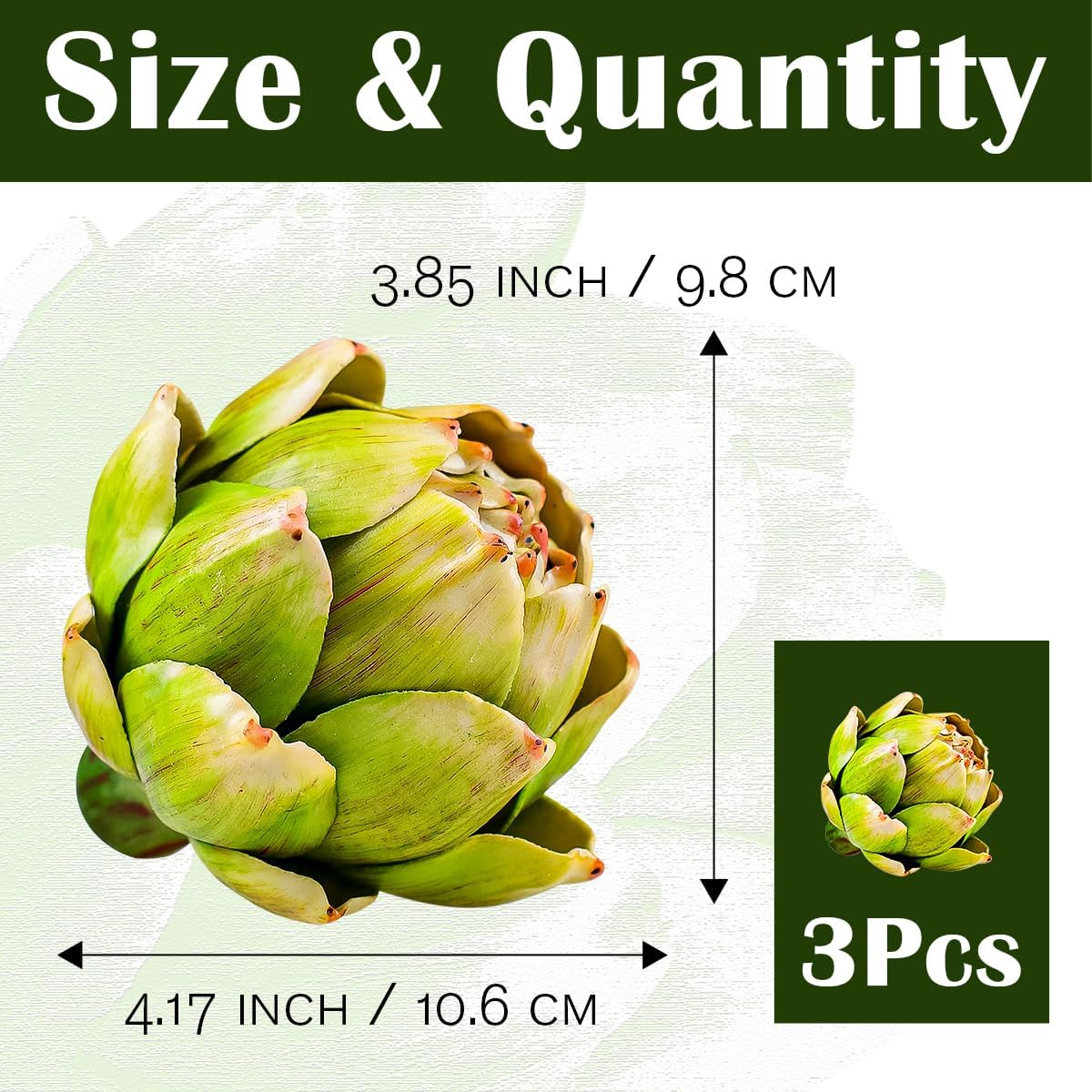 Fake vegetable display: you will receive 3 large artificial green artichoke heads with a height of 10.6 cm and a width of 9.8 cm, which are very suitable for crafts and creative decorating, and can also be used as part of a vibrant flower wreath.