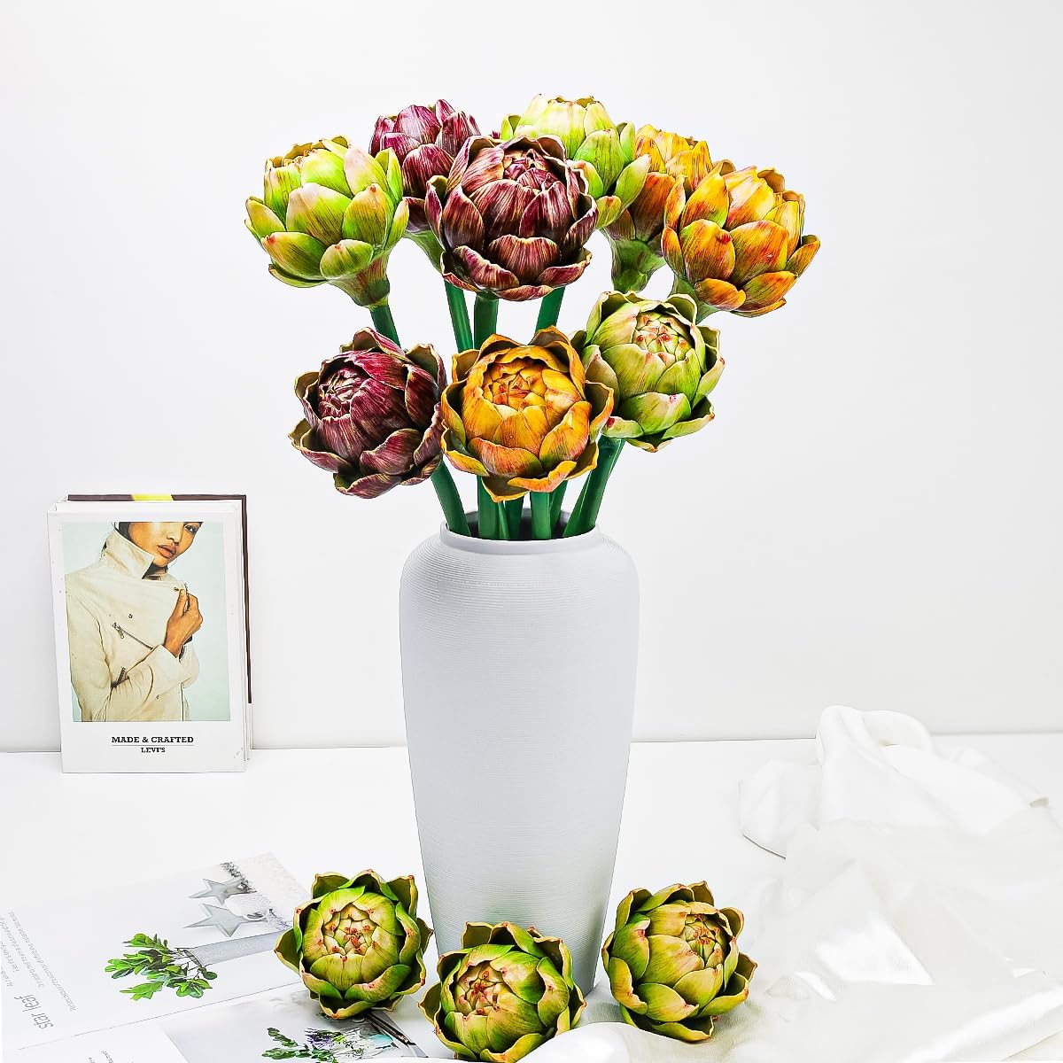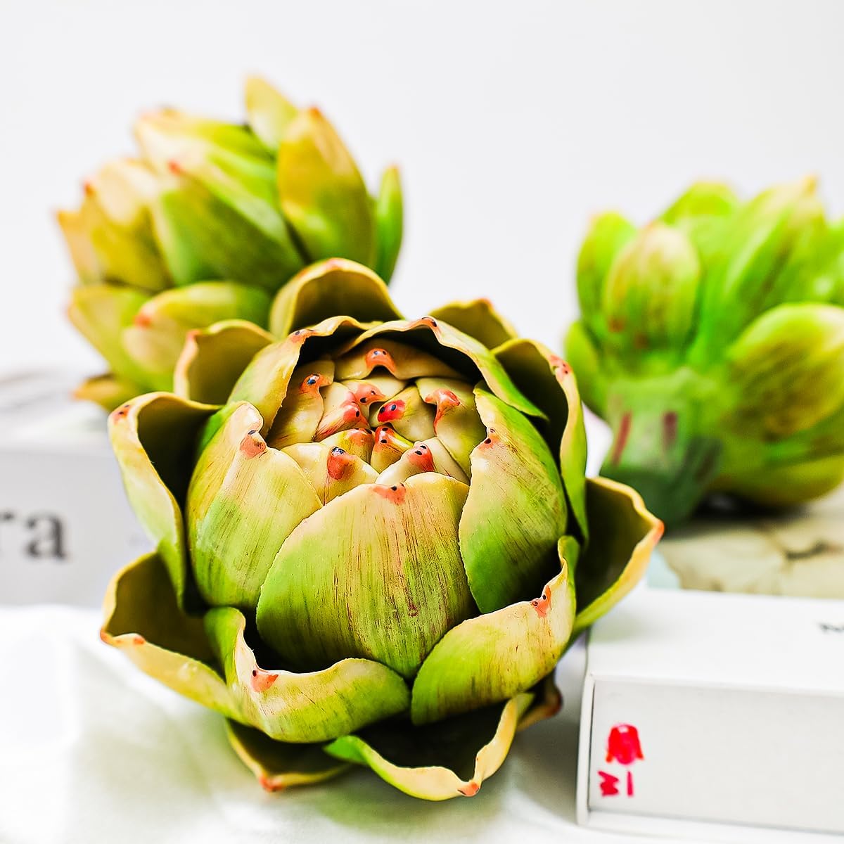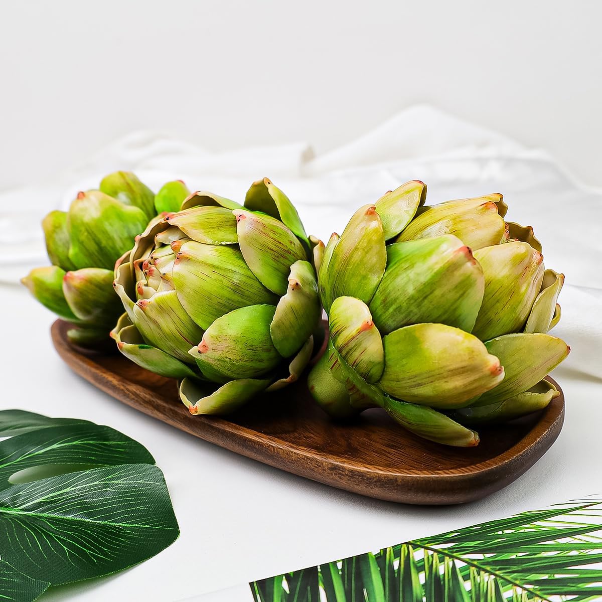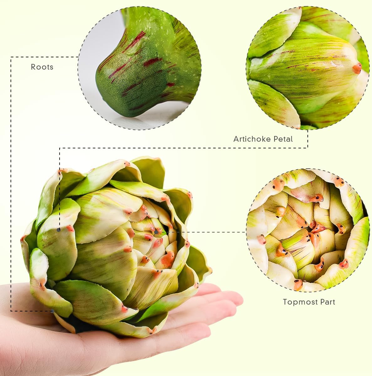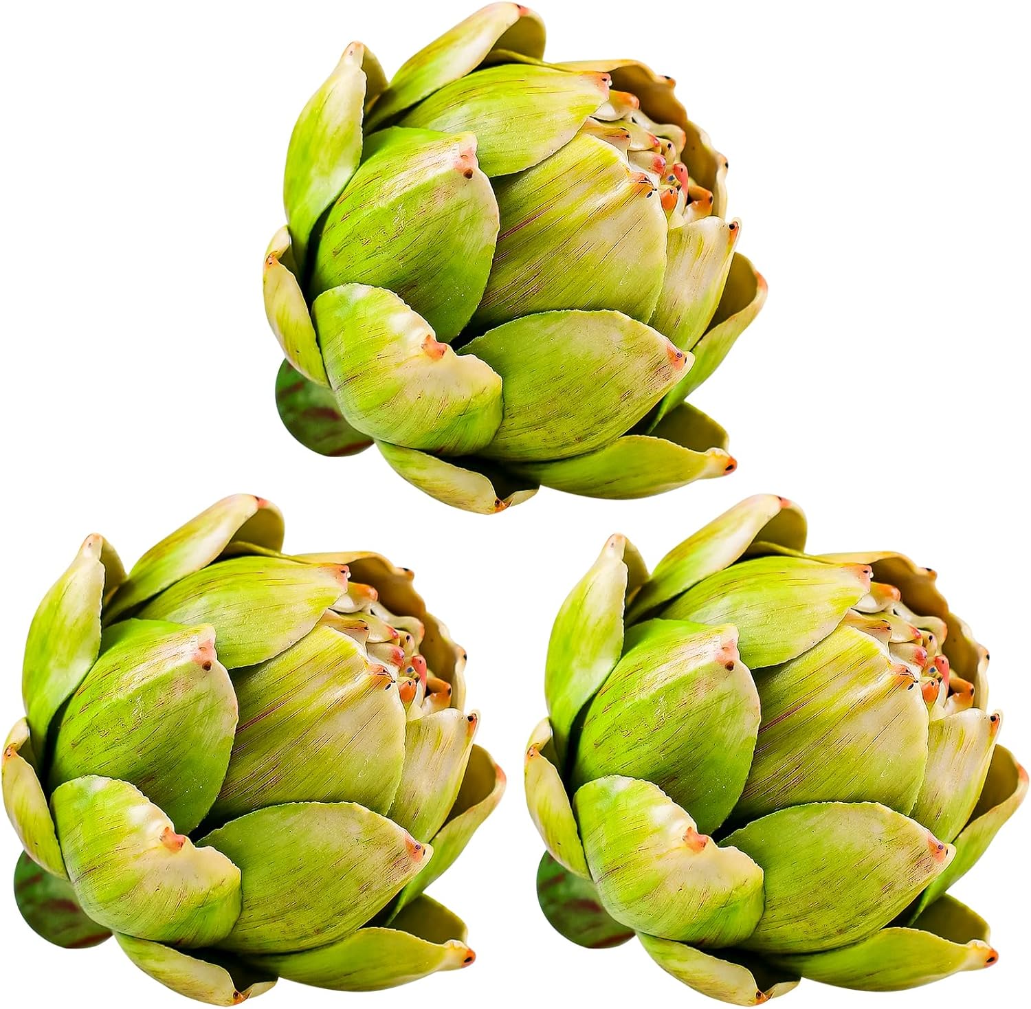 Artificial Artichoke Head The artificial artichoke ornaments have a natural appearance and are made of plastic, which is finely crafted and will not wither or fade. Whether you place these realistic vegetable decorations in a vase or on a table, they will add the finishing touch to your space.