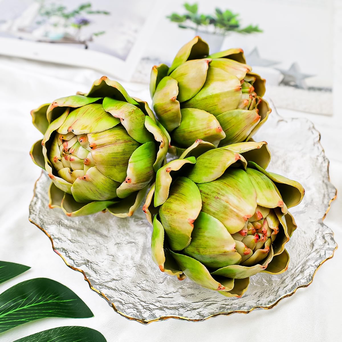 Vase filling decoration: fake lifelike fruit display can add a touch of color to your kitchen, living room, dining room, office or bedroom space. Large green artificial artichoke head provides the opportunity for DIY decoration, whether placed in a transparent glass, scattered on a table, or used as shooting props for product photography, these artichokes vegetables can add a touch of creativity to your scene.