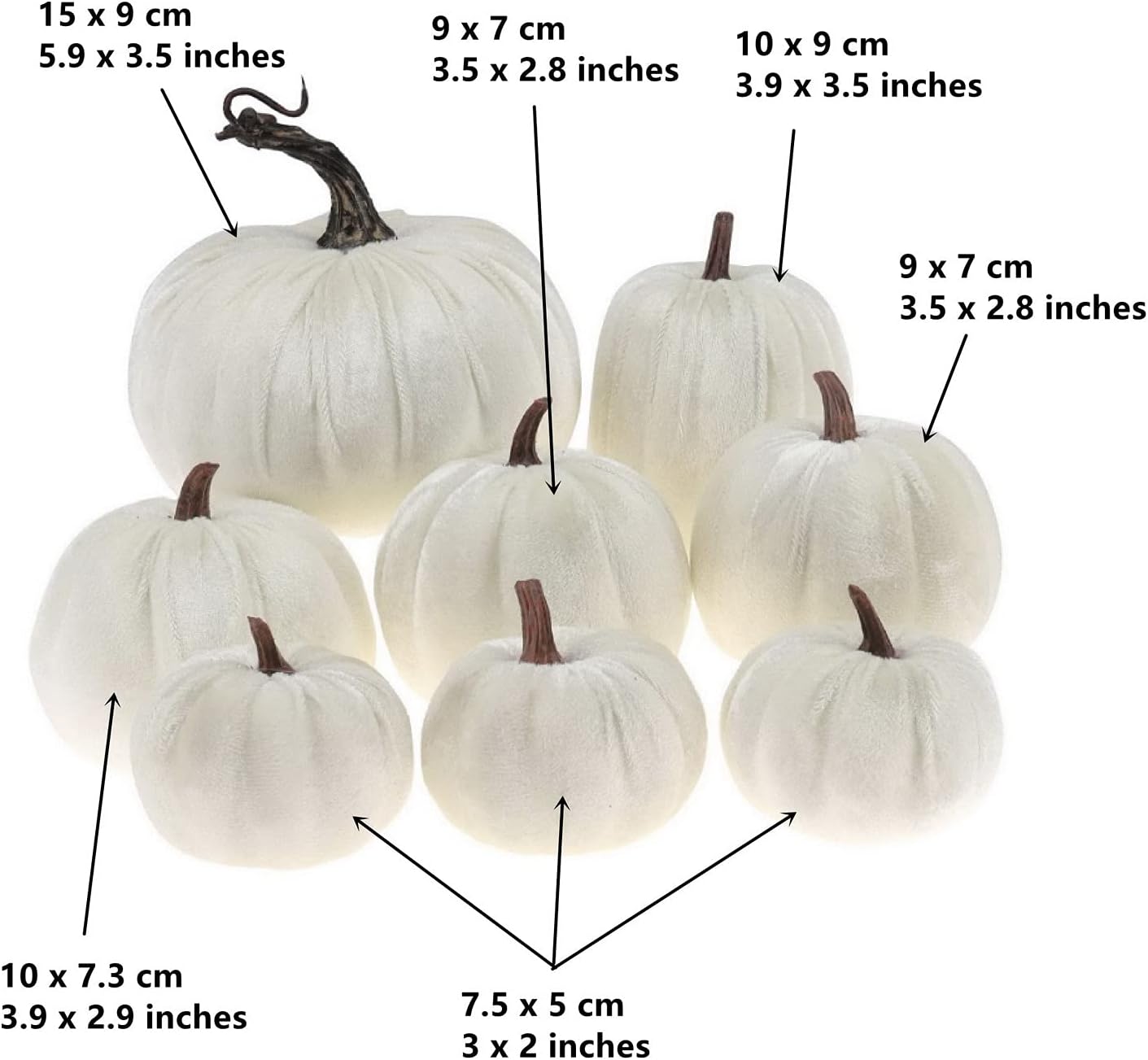 Пакетът съдържа 8 кожени тикви с различни размери: 1 x 5,9 инча, 1 x 3,9 инча, 3 x 3,5 инча, 3 x 3 инча.