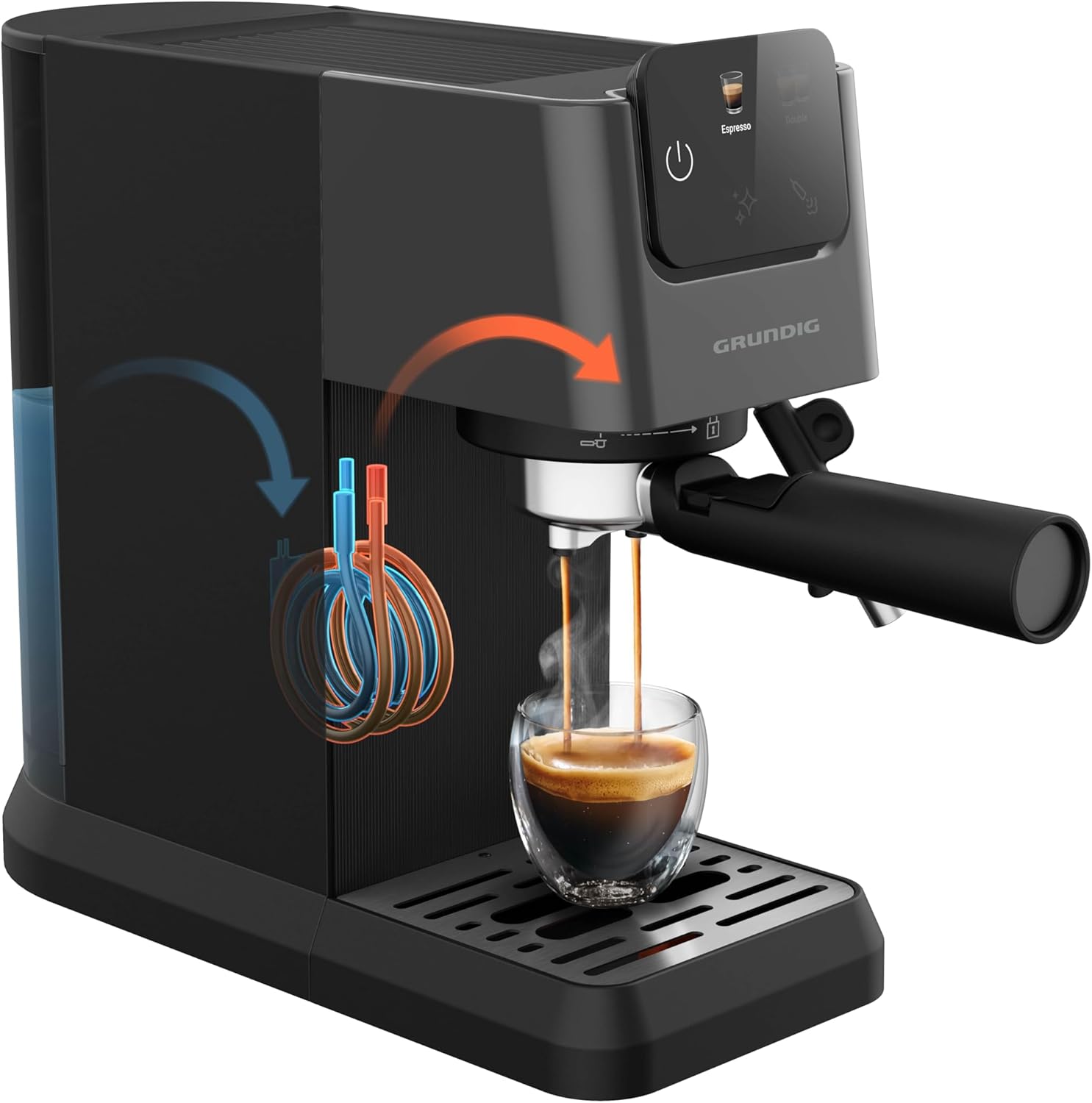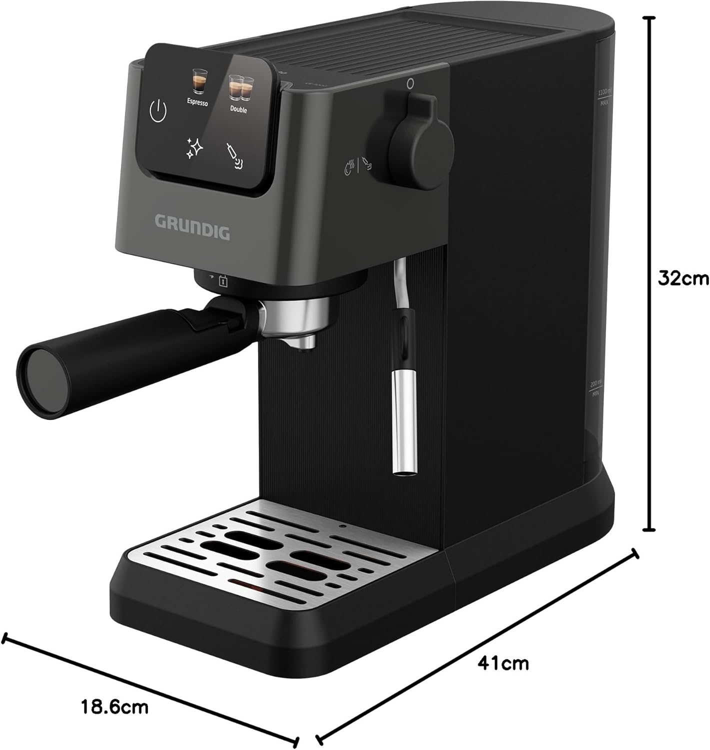 GRUNDIG KSM 4330 Портафилтърна машина с дюза за разпенване на мляко, машина за еспресо, за смляно кафе, подвижен резервоар за вода, сензорен дисплей, мощност 1628 W, функция памет, черен цвят