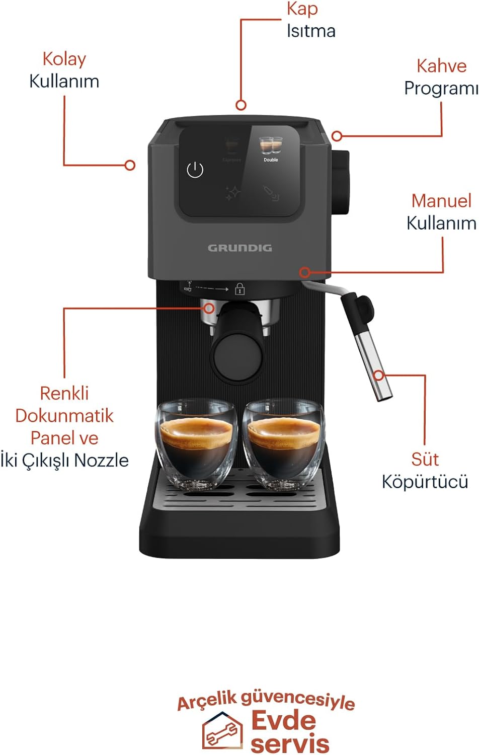 • С мощност от 1628 W и налягане на помпата от 15 бара, тази машина с портафилтър Grundig ви позволява да се наслаждавате на кафето си като в любимото си кафене: ароматно еспресо и кремообразна млечна пяна.