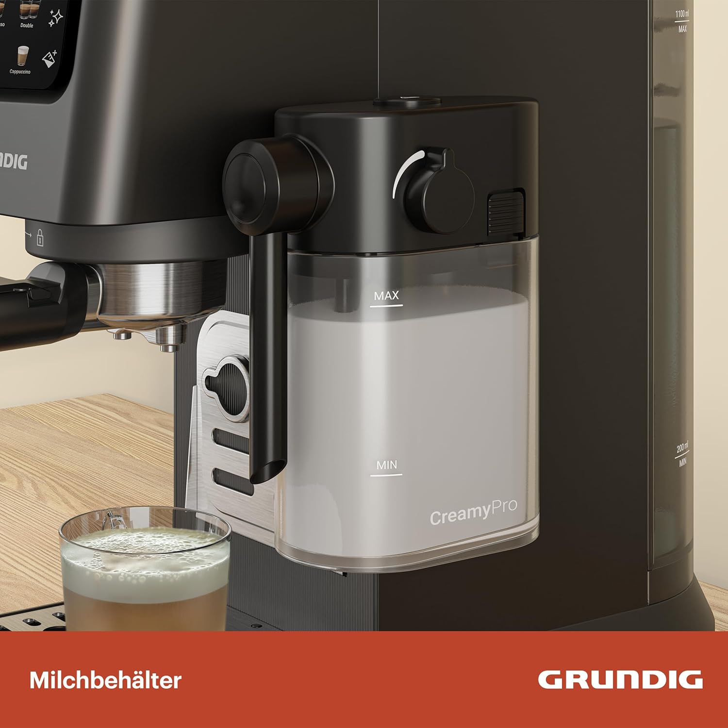 GRUNDIG KSM 5330 Портафилтърна машина с вграден контейнер за мляко, мощност 1628 W, налягане на помпата 15 бара, двойна дюза, цветен сензорен дисплей, BrewSense, CreamyPro, тъмен инокс/черен