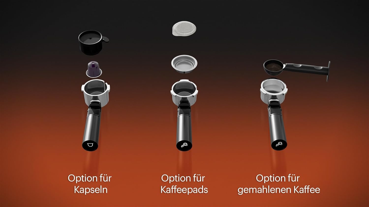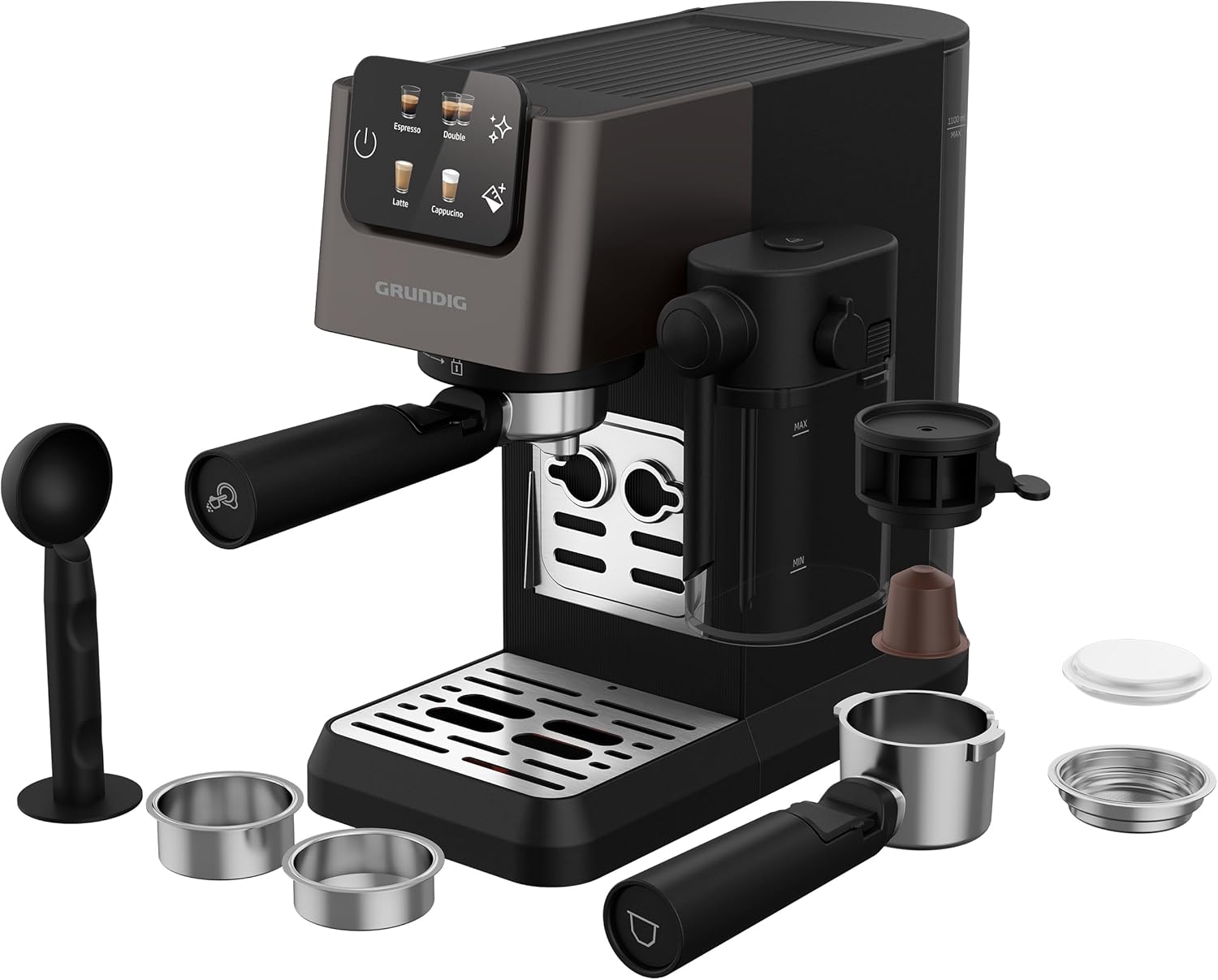 GRUNDIG KSM 6430 Портафилтърна машина с вграден контейнер за мляко, мощност 1628 W, налягане на помпата 20 бара, двойна дюза, цветен сензорен дисплей, BrewSense, CreamyPro, тъмен инокс/черен
