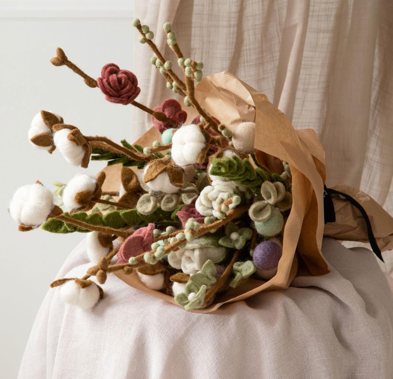 Gry & Sif Ръчно изработени и сертифицирани по Fairtrade стилни датски дизайни от непалски занаятчии | Филцов евкалипт - Изкуствени цветя за декорация на хол | Зелено | Комплект от 3