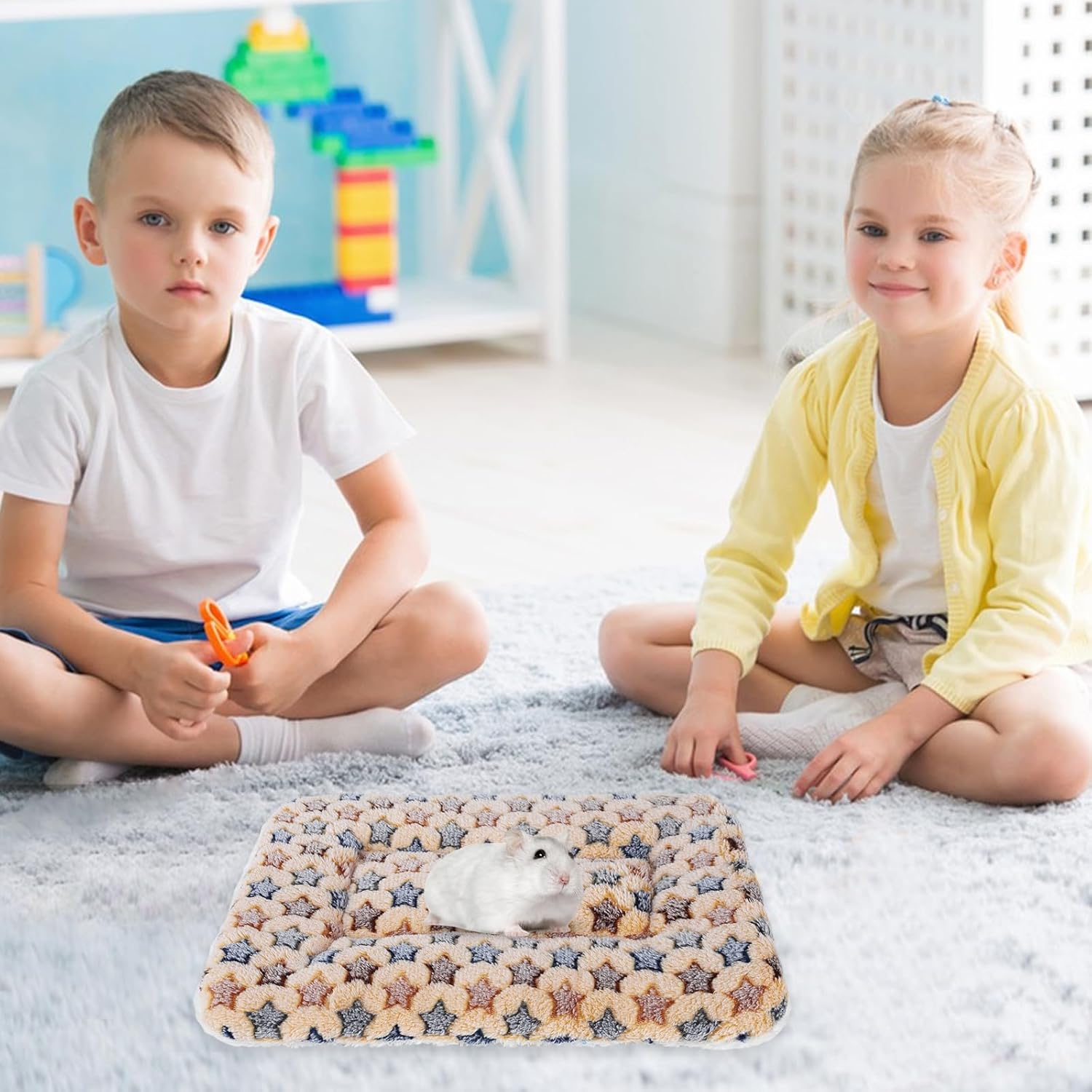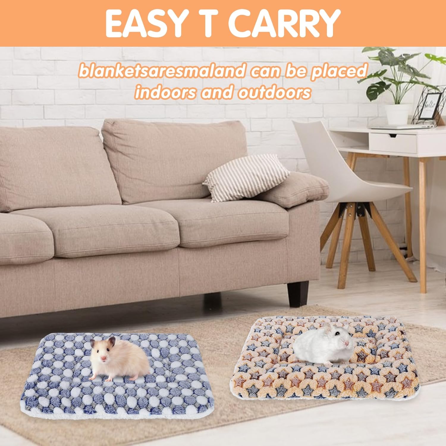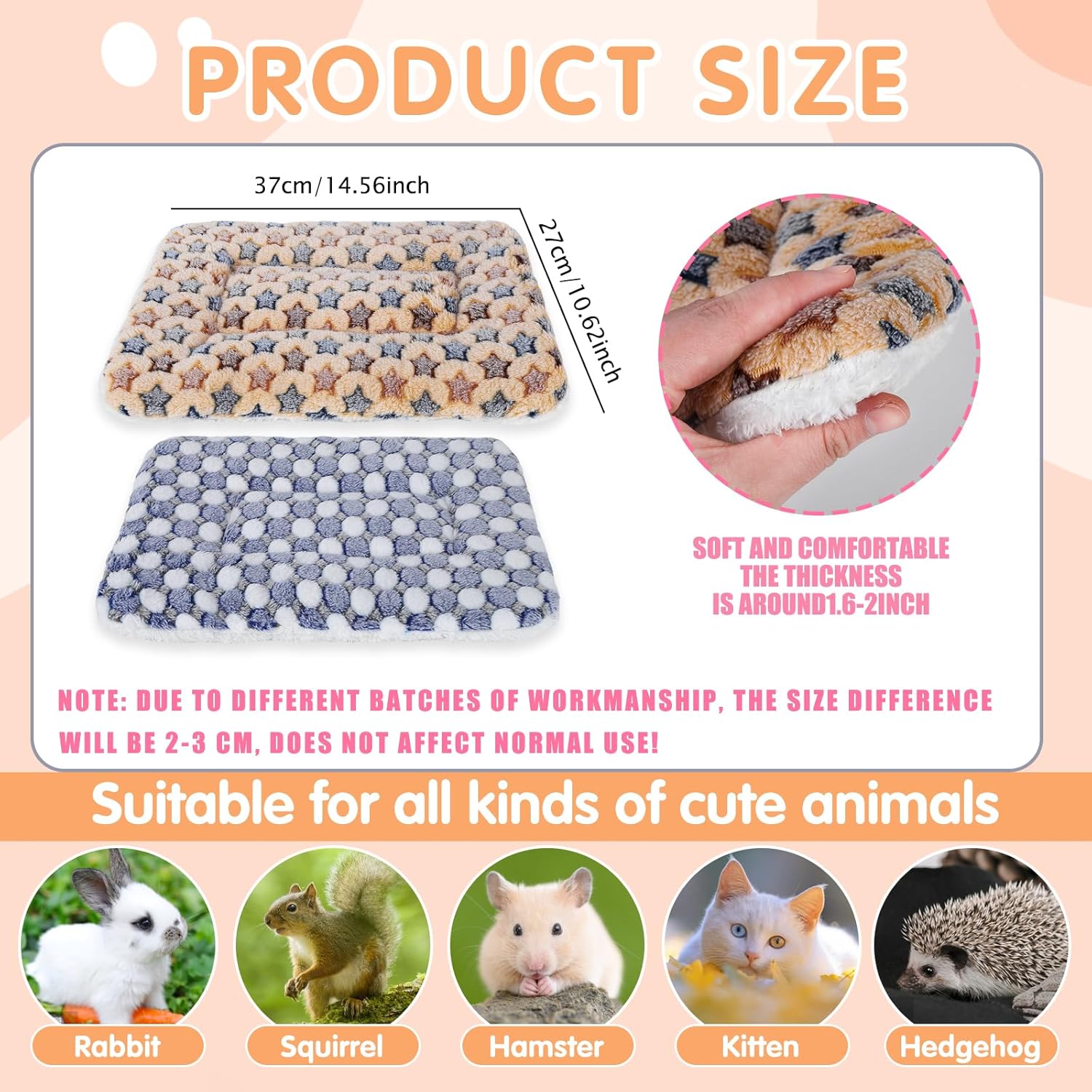 - С размери 35 x 27 x 3 см, нашите постелки за легло за малки животни могат да бъдат подходящи за кученца, хамстери, морски свинчета, чинчили, порове, зайци, катерици и бурундуци и др. Могат да се поставят директно на пода, дивана или леглото, но също така и в клетки, скривалища или пещерни легла.
