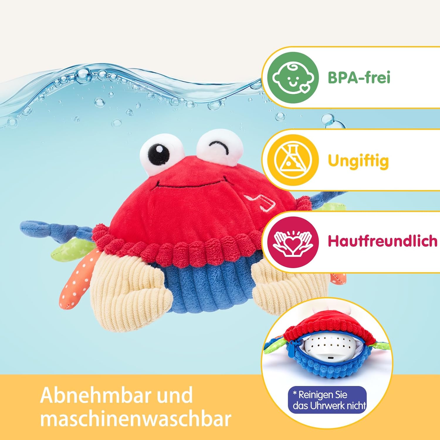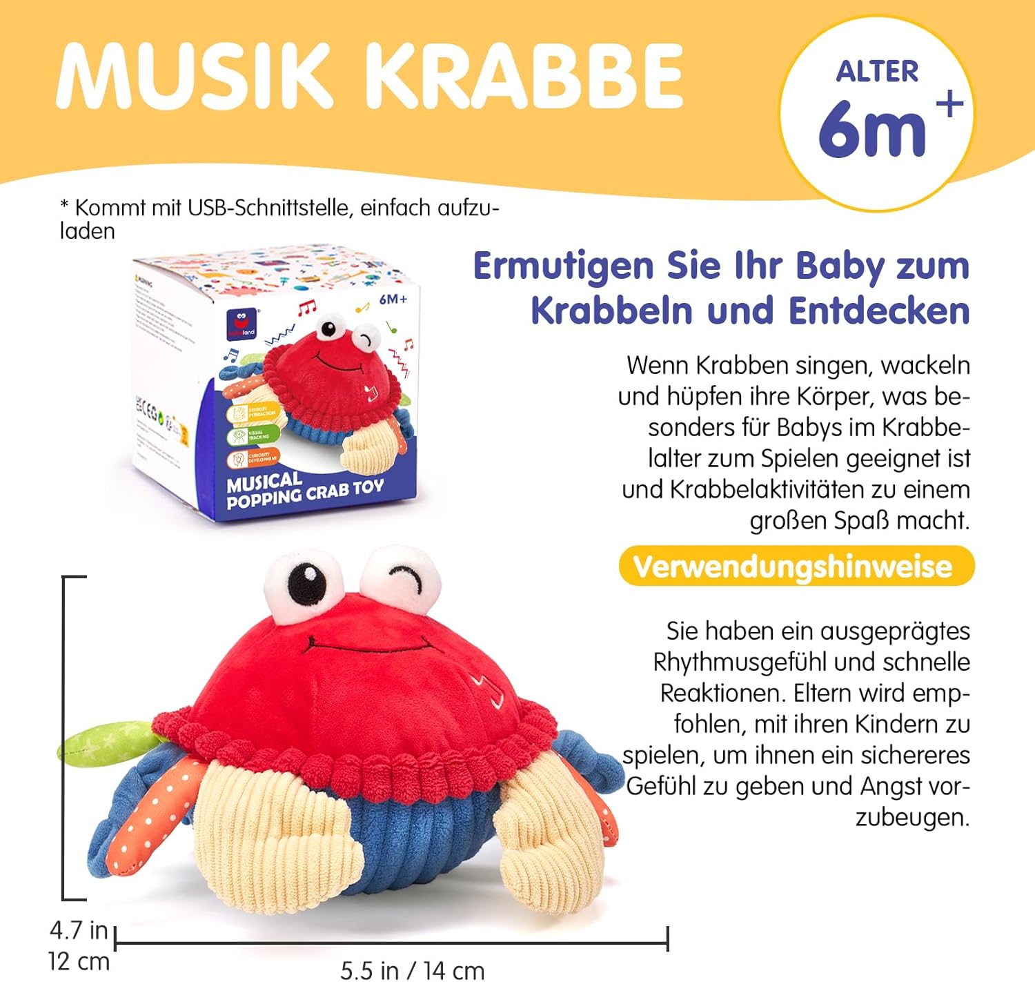 • 【Музикална играчка за пълзене】Тази бебешка играчка за 6-месечни деца е с ярки цветове, свири нежна музика и подскача с безопасно за детето темпо. Ракът имитира движенията на истински рак, като игриво насърчава пълзенето, сетивното възприятие и развитието на грубата моторика.