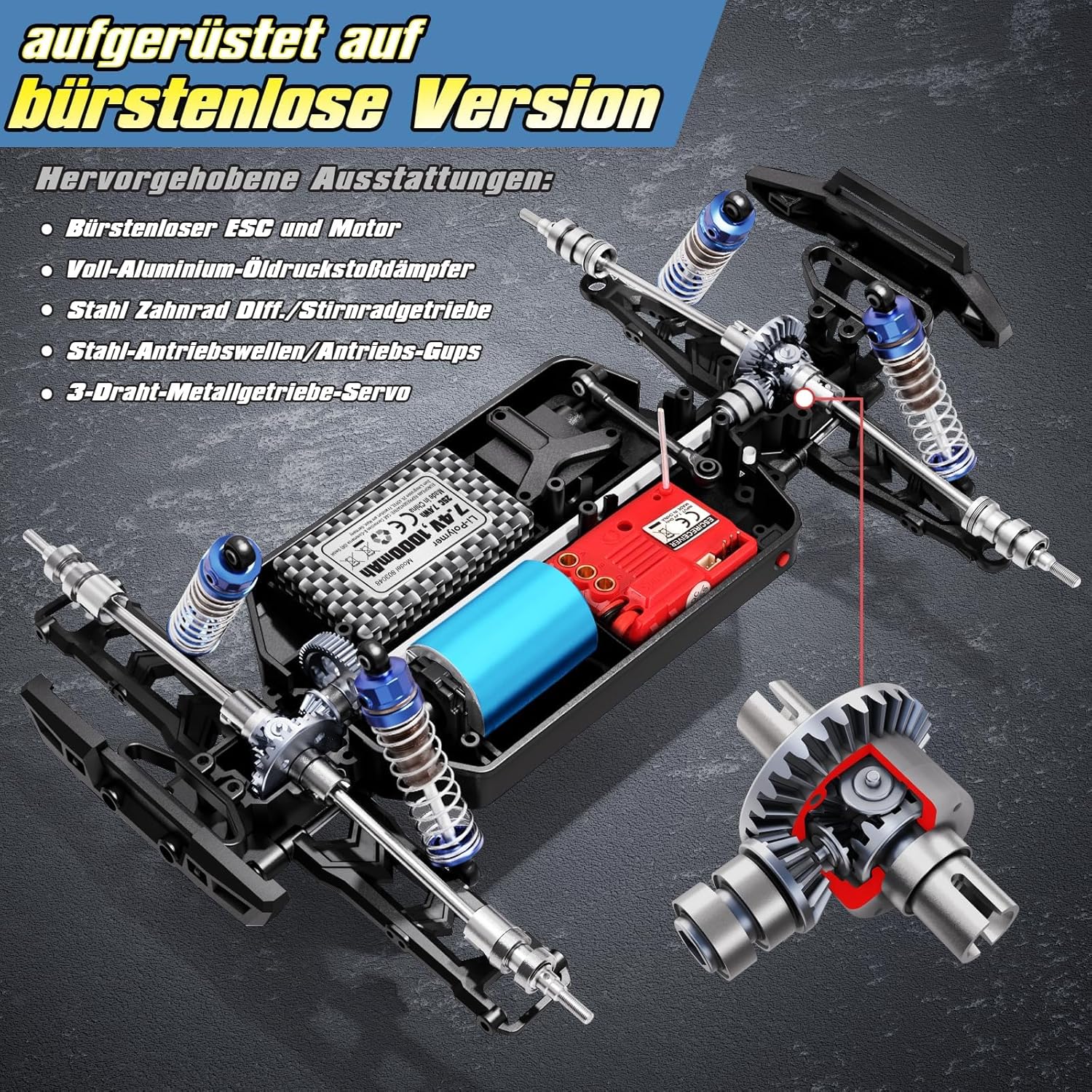 • Изцяло метален удароустойчив монстър камион с дистанционно управление: дистанционно управляваният офроуд автомобил е оборудван с най-новите независими ултра твърдотелни маслени амортисьори, изработени от алуминий, с 4x4 задвижване на четирите колела с удароустойчивост, гравитация и контрол на скоростта. Металната предавка и металният диференциал разпределят силата по-добре. Плавният ефект на 16-те сачмени лагера намалява загубата на мощност. Офроуд възможности и издръжливост, офроуд RC crawler предлага впечатляваща скорост и стабилно шофиране.
