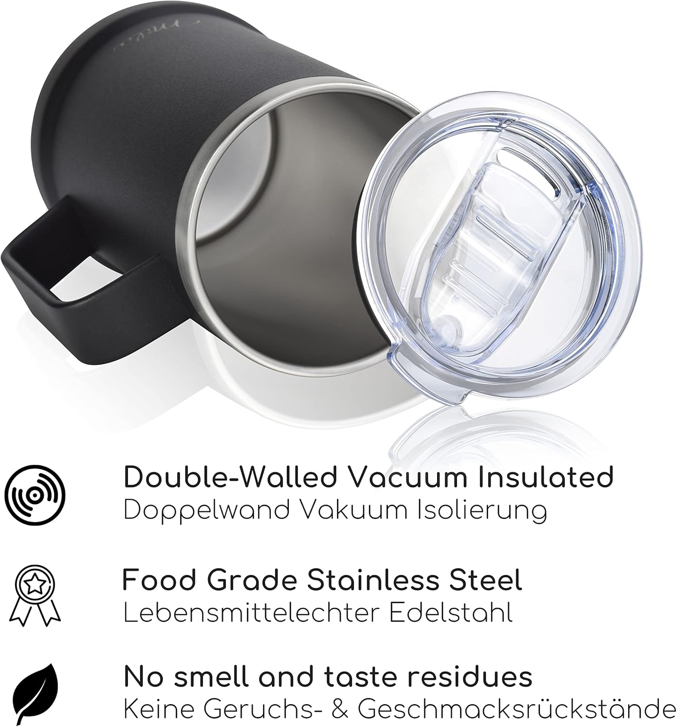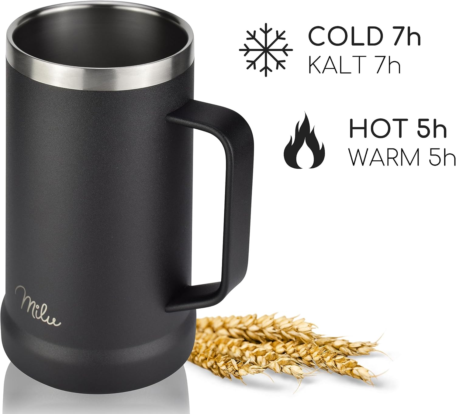 Халба за бира Milu от неръждаема стомана с изолация | Чаша за бира с капак | Термос с дръжка | Подарък за бира за мъже, татко | Запазва студена 7 часа (700 мл, черна)