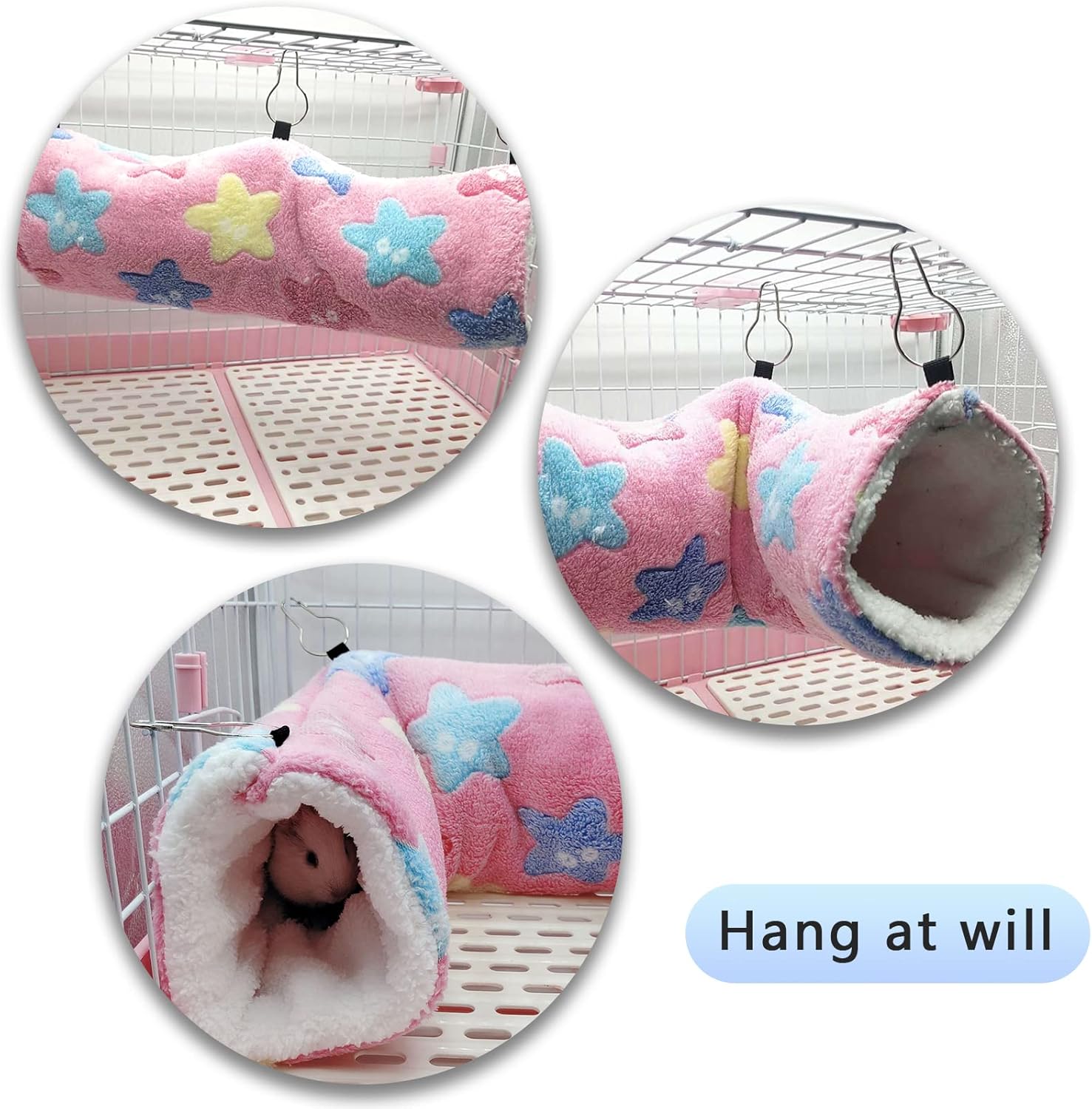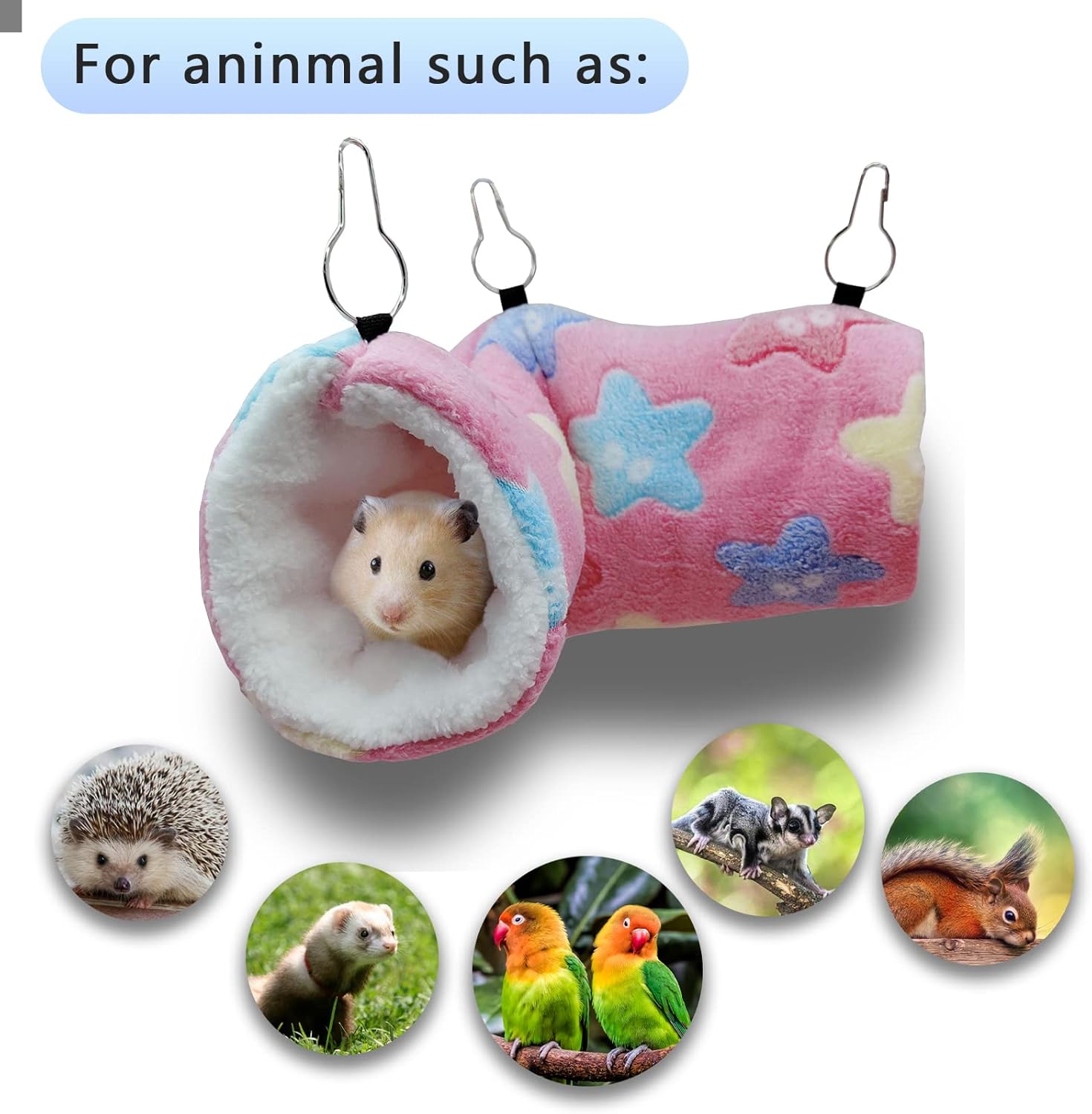 • Подходящи животни: Този размер тунел за морски свинчета е подходящ за хамстери, сирийски хамстери, джербили, захарни планери, плъхове, чинчили, дегу, млади морски свинчета, таралежи, червени катерици, порове, мишки, бурундуци, ара, малки гущери, зайци, корели, птици и др. Аксесоарите за морски свинчета са супер удобно място за почивка и могат да се използват за домашни любимци. Пазете от студа, което е полезно за здравето.
