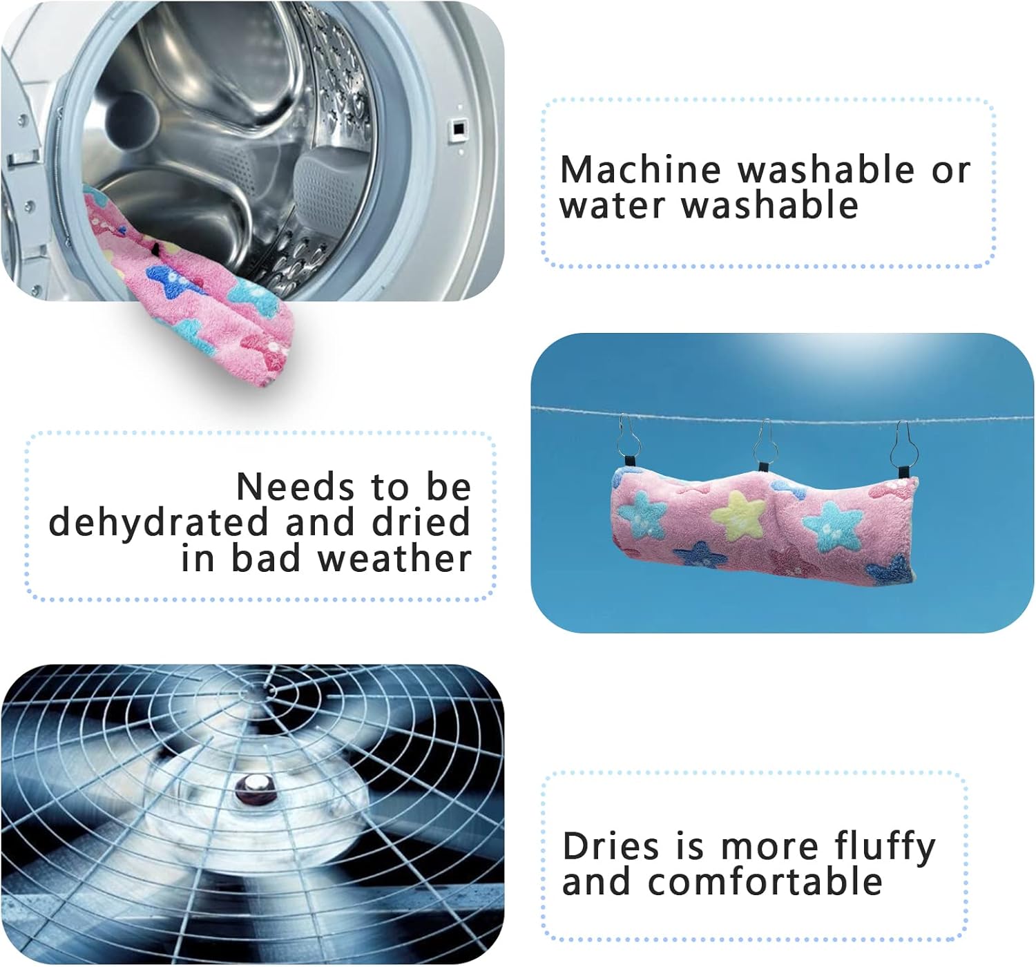 • Лесно за употреба и почистване: малкото легло за животни се закрепва лесно и бързо към клетките с включените 3 метални куки, подходящи за клетки за домашни любимци със стандартен размер. Тунелите за домашни любимци и тръбните играчки могат да се използват многократно след измиване.
