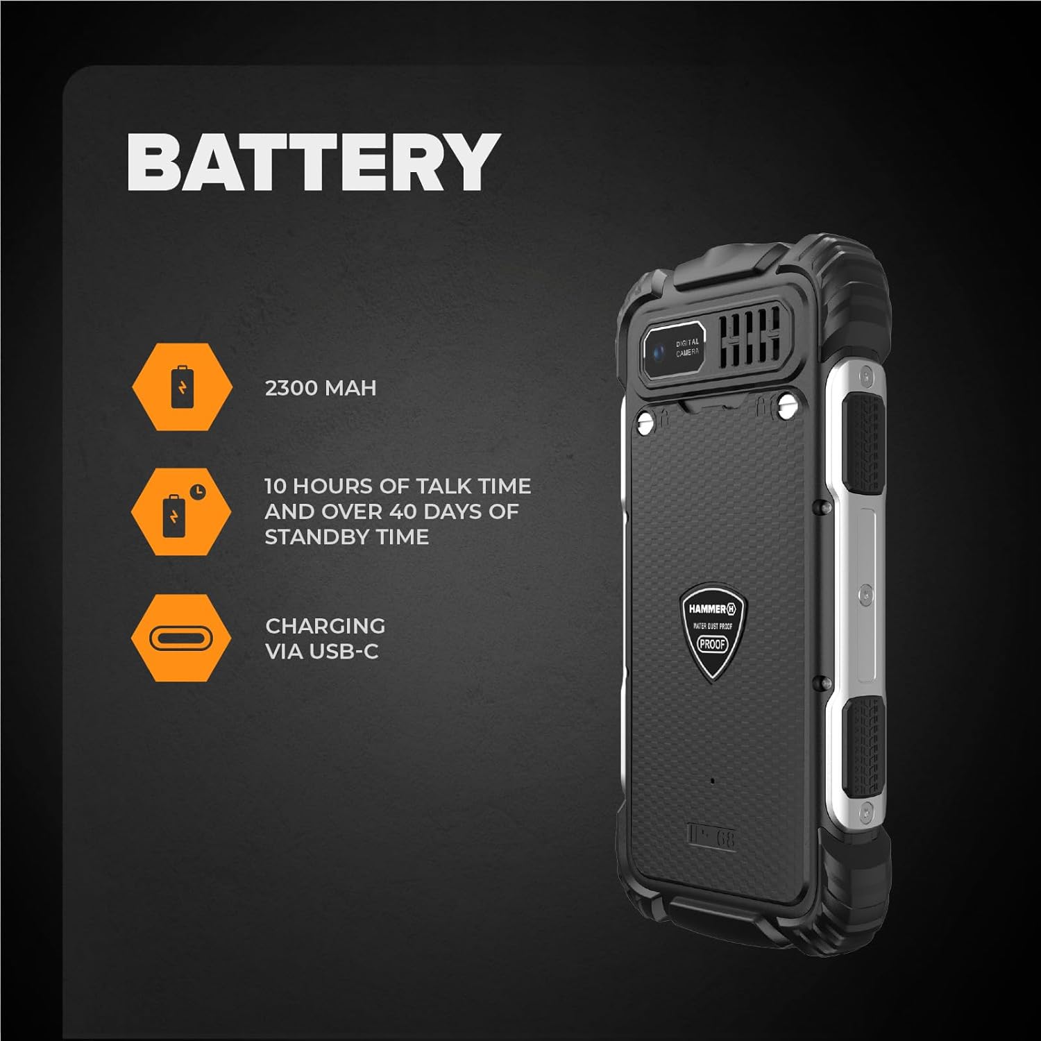Резервна батерия и издръжливост: След като батерията се изтощи, сменете я за секунди - благодарение на подвижния заден капак. Опционалната станция за зареждане и металните подсилващи елементи с болтове намаляват последващите разходи и удължават експлоатационния живот. Инвестирайте в устройство, което ще издържи години. Hammer Power Plus е създаден за суровата реалност.