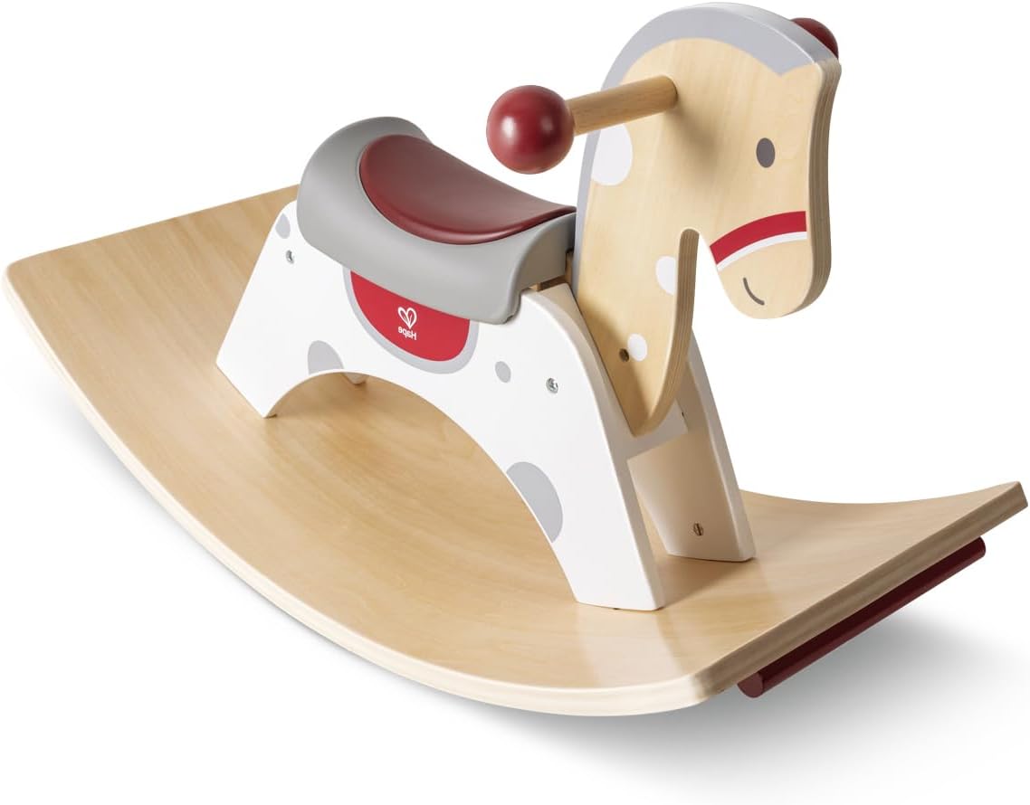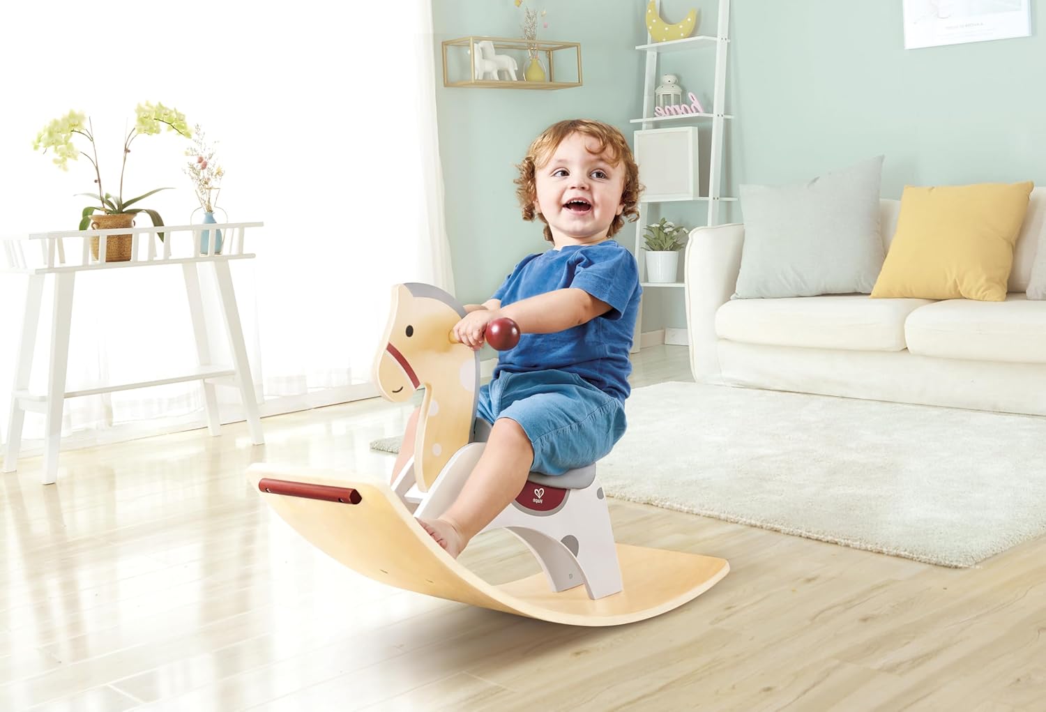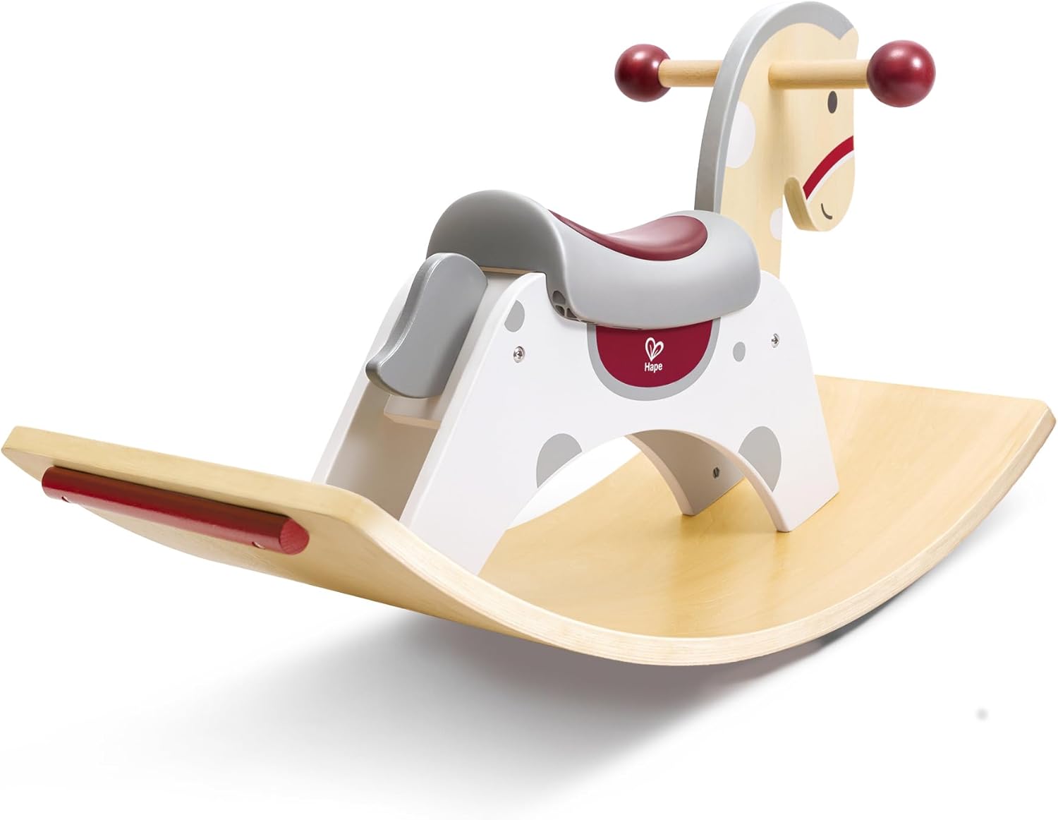 Язденето на този красив люлеещ се кон е много забавно. Той има удобна седалка, лесни за хващане дръжки и класически дизайн. Когато конят се развие, извитата основа може да се използва като дъска за баланс.
