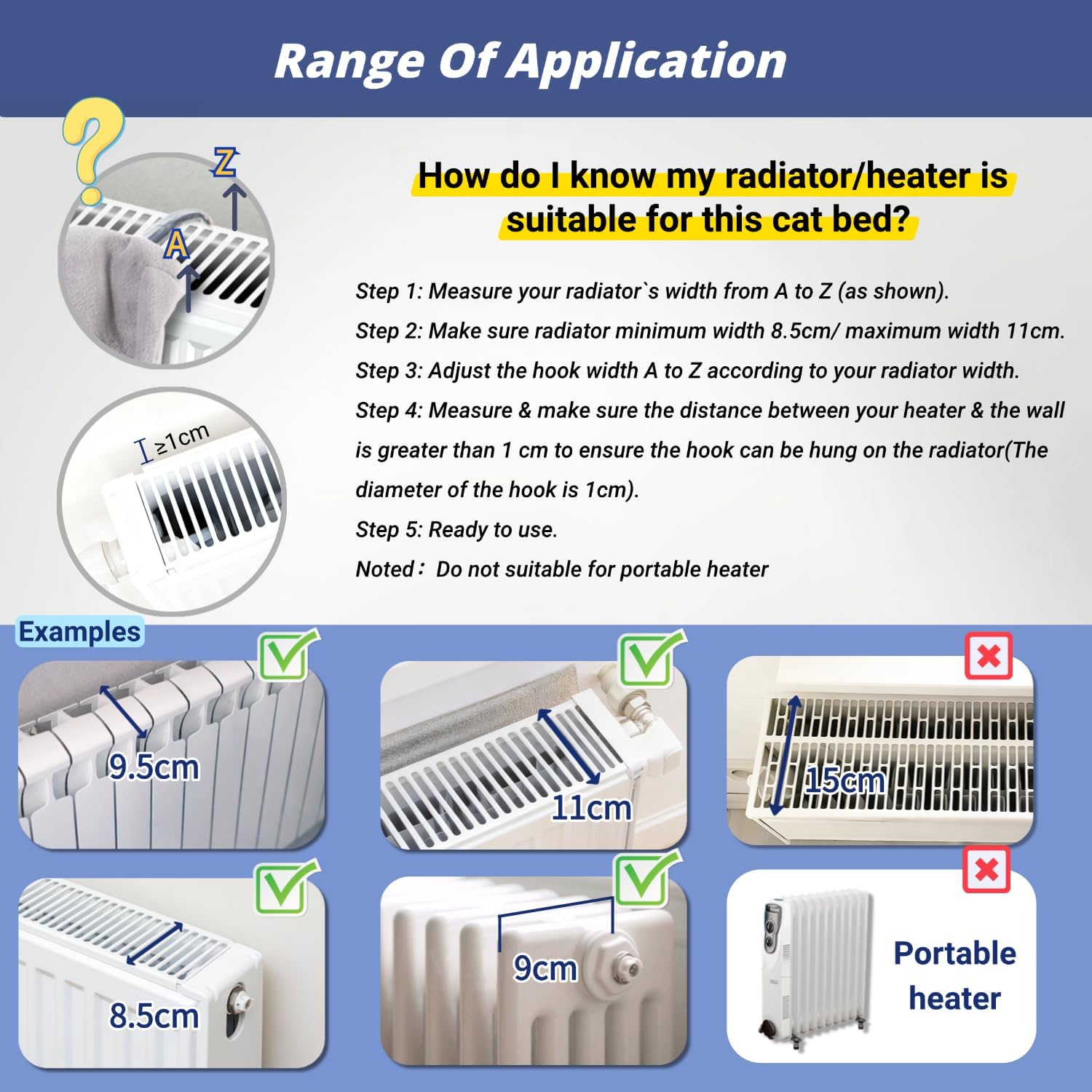 • 【Регулируема кука и приложение】Куката се регулира чрез завъртане от 8,5 см до 11 см, подходяща за повечето стенни радиатори/отоплятели. (Забележка: измерете предварително, ширината на вашия радиатор трябва да е поне 8,5 см и не повече от 11 см)