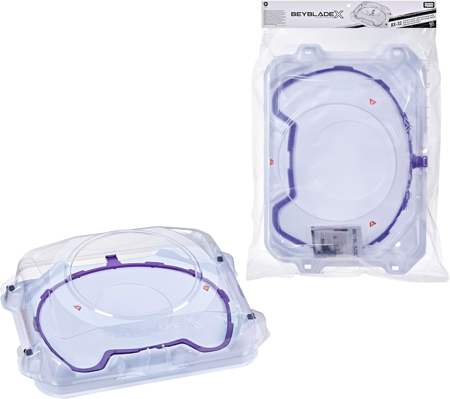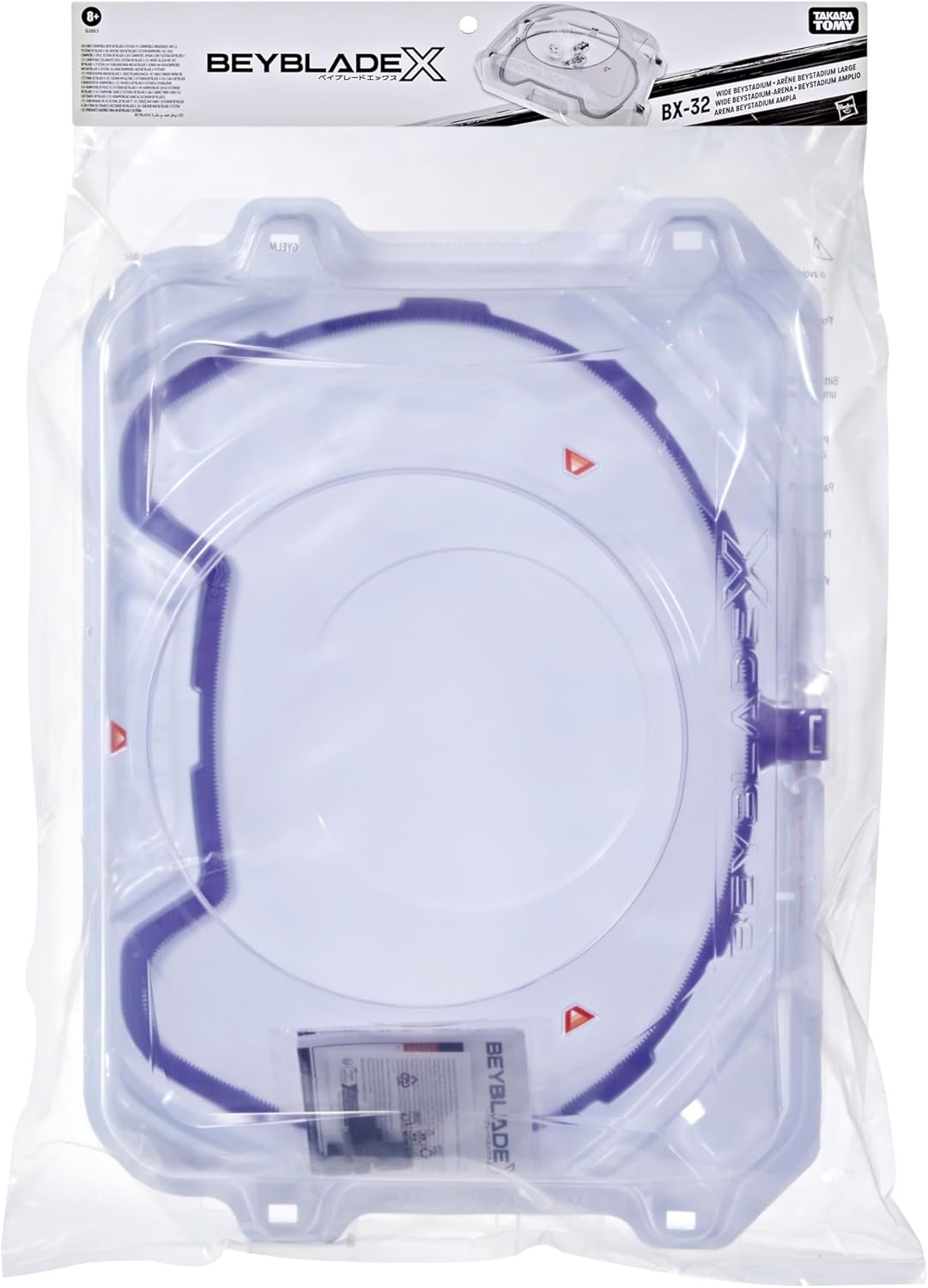 Следващото поколение арени, пускови установки и топове на Beyblade Stadium: Beyblade X. Тук играчите на Beyblade могат да се бият с топовете си и да печелят точки. Първият, който достигне 4 точки, печели. Арената BX-32 Wide Beystadium е автентичният стадион Takara Tomy от Япония. Тя е идеална за играчи, ентусиасти и колекционери на Beyblade. Стадионът е с правоъгълен дизайн, което позволява на 3 Beyblade играчи да се бият едновременно, което прави битките с Beyblade още по-вълнуващи! Той се гордее със системата за ускорение X-Celerator: Когато екипировката на топа Beyblade X се зацепи с пистата X-Celerator на арената Beystadium, той се изстрелва около стадиона със супер ускорение (Xtreme Dash) за страхотни сблъсъци. Стадионът е съвместим с пускови установки Beystadium и топове Beyblade X със сменяеми остриета, тресчотки и битове (пусковите установки и топовете се продават отделно, в зависимост от наличността). Топовете Beyblade с автентични метални части Takara Tomy са чудесен подарък за деца на възраст 8 и повече години. Hasbro и всички свързани термини са търговски марки на Hasbro.