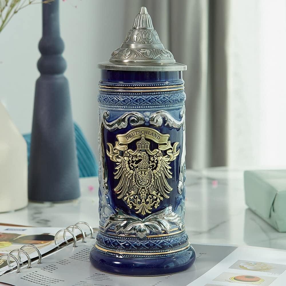 HAUCOZE Халба за бира с капак, каменна халба за бира, немски калаен герб, халба за бира за баща, мъж, подарък за рожден ден, 0.6 литра