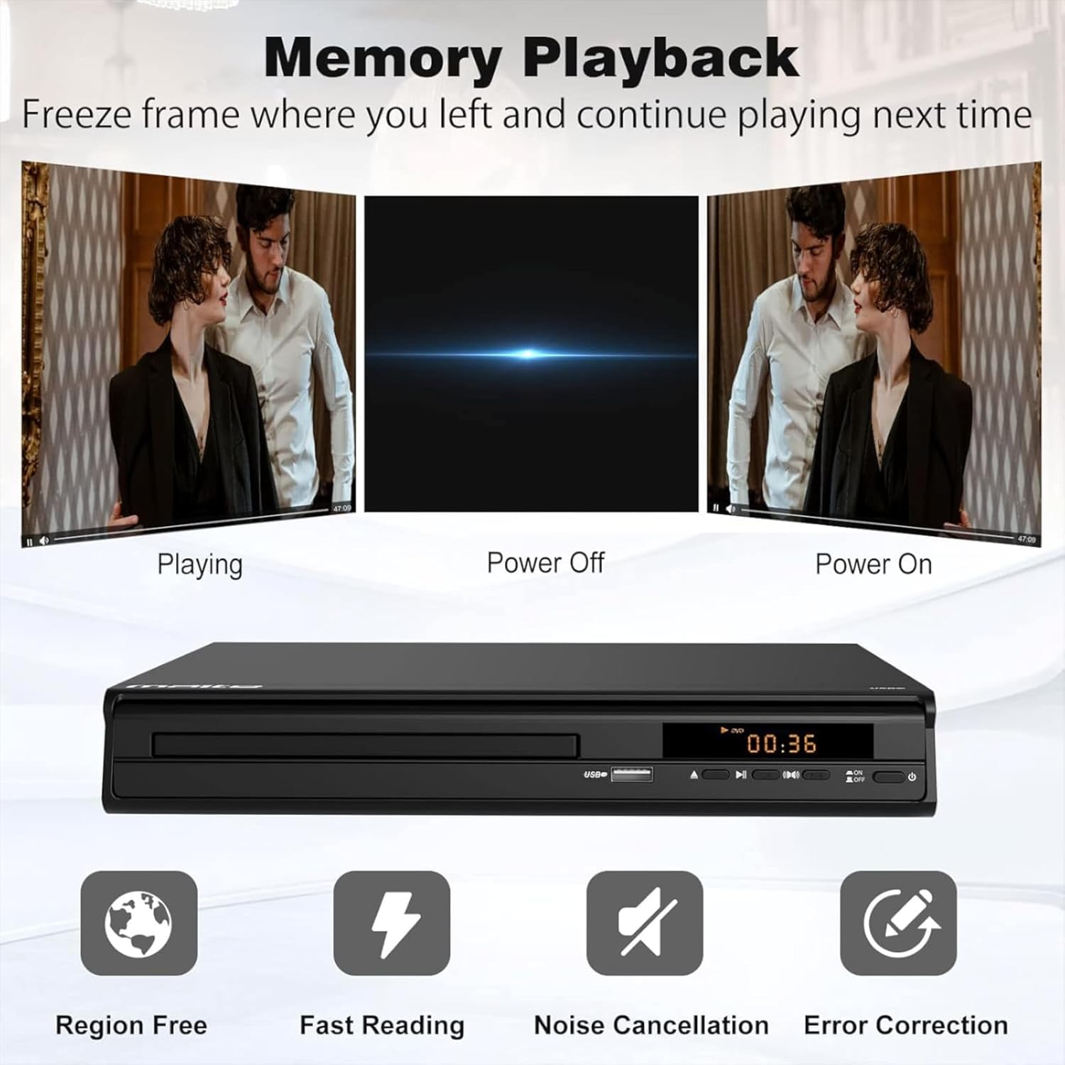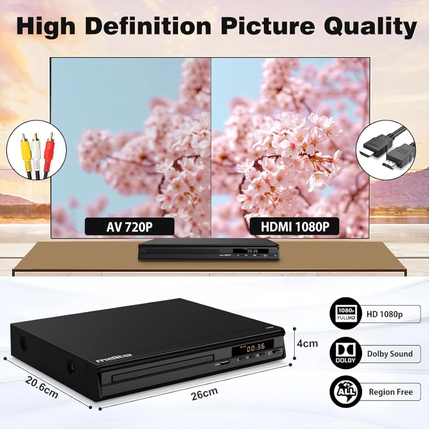 • Дисплей и звук: 1080P HD DVD плейърът може да възпроизвежда медийни файлове през HDMI, USB или AV портове, осигурявайки ясни изображения с добро качество на звука. Можете да контролирате възпроизвеждането, да прескачате, да поставяте на пауза и да повтаряте, както желаете. Този AV&HDMI DVD плейър е съвместим със смарт телевизори, конвенционални телевизори, монитори, проектори и системи за домашно кино.