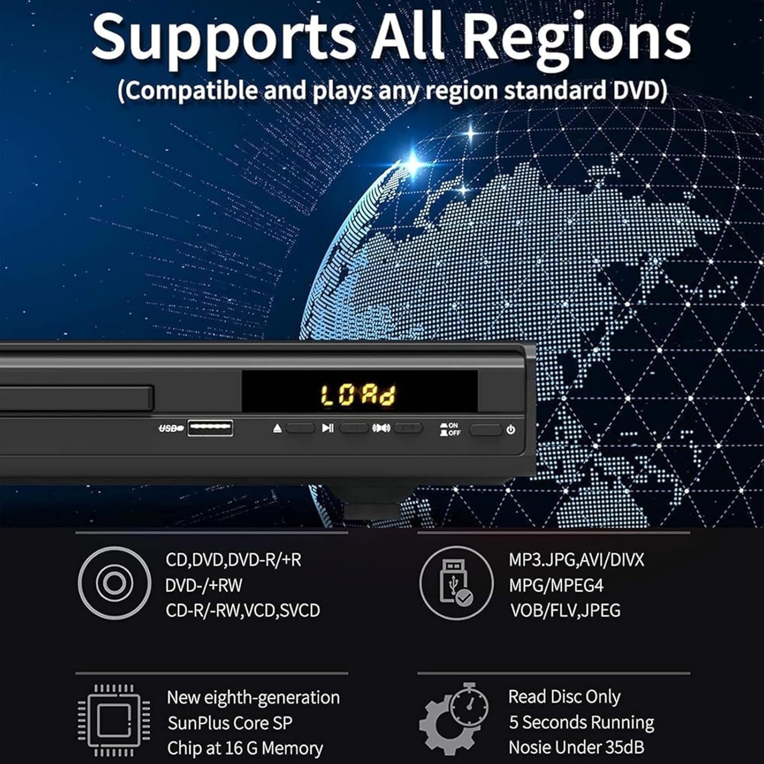 • Характеристики: DVD плейърът за телевизор с HD588A драйвер и SunPlus процесор от 8-мо поколение позволява до 2 пъти по-висока скорост на четене и тиха работа. Поддържа функция за възстановяване и автоматична корекция на рязкостта на изображението. Плейърът работи на 50/60 Hz и има енергийно ефективни работни характеристики.