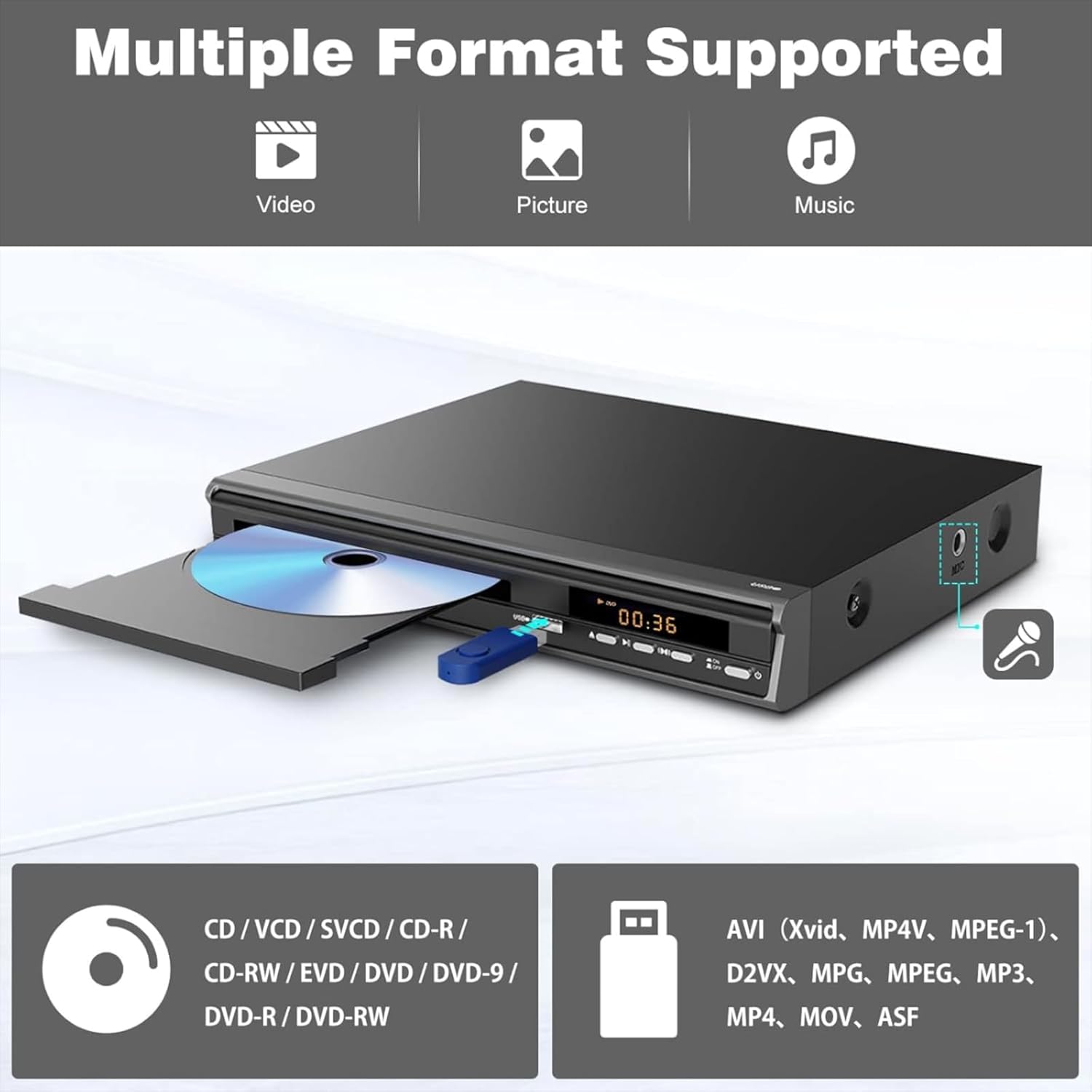 • 【Пълна съвместимост】Този DVD плейър, който не е свързан с регионални дискове, поддържа множество формати, като CD/VCD/SVCD/CD-R/CD-RW/EVD/DVD-9/DVD-R/DVD-RW9 (с изключение на Blu-Ray). Чете USB файлове до 720P, поддържани формати: AVI (Xvid, MP4V, MPEG-1), D2VX, MPG, MPEG, MP3, MOV, ASF. С вход за микрофон за караоке със семейството и приятелите.