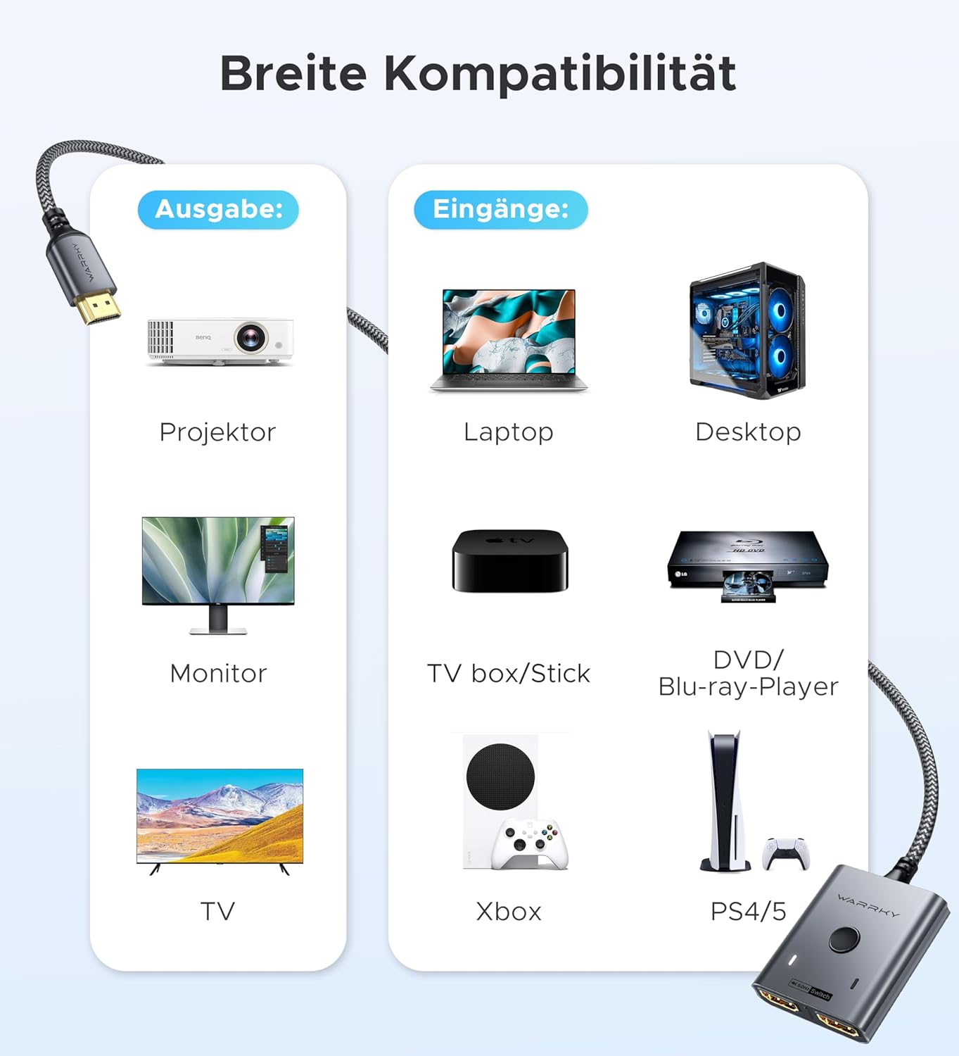 • Универсална съвместимост: Този 1 към 2 HDMI двоен щепсел е plug and play, съвместим с повечето устройства със стандартен HDMI интерфейс (не за ARC, eARC): PlayStation 3 / 4 / 5, Xbox One / Series / 360, Nintendo Switch, Roku, Chromecast, Fire Stick, лаптоп и др. Дисплеи: UHD / FHD / HD телевизори, монитори, проектори и други.