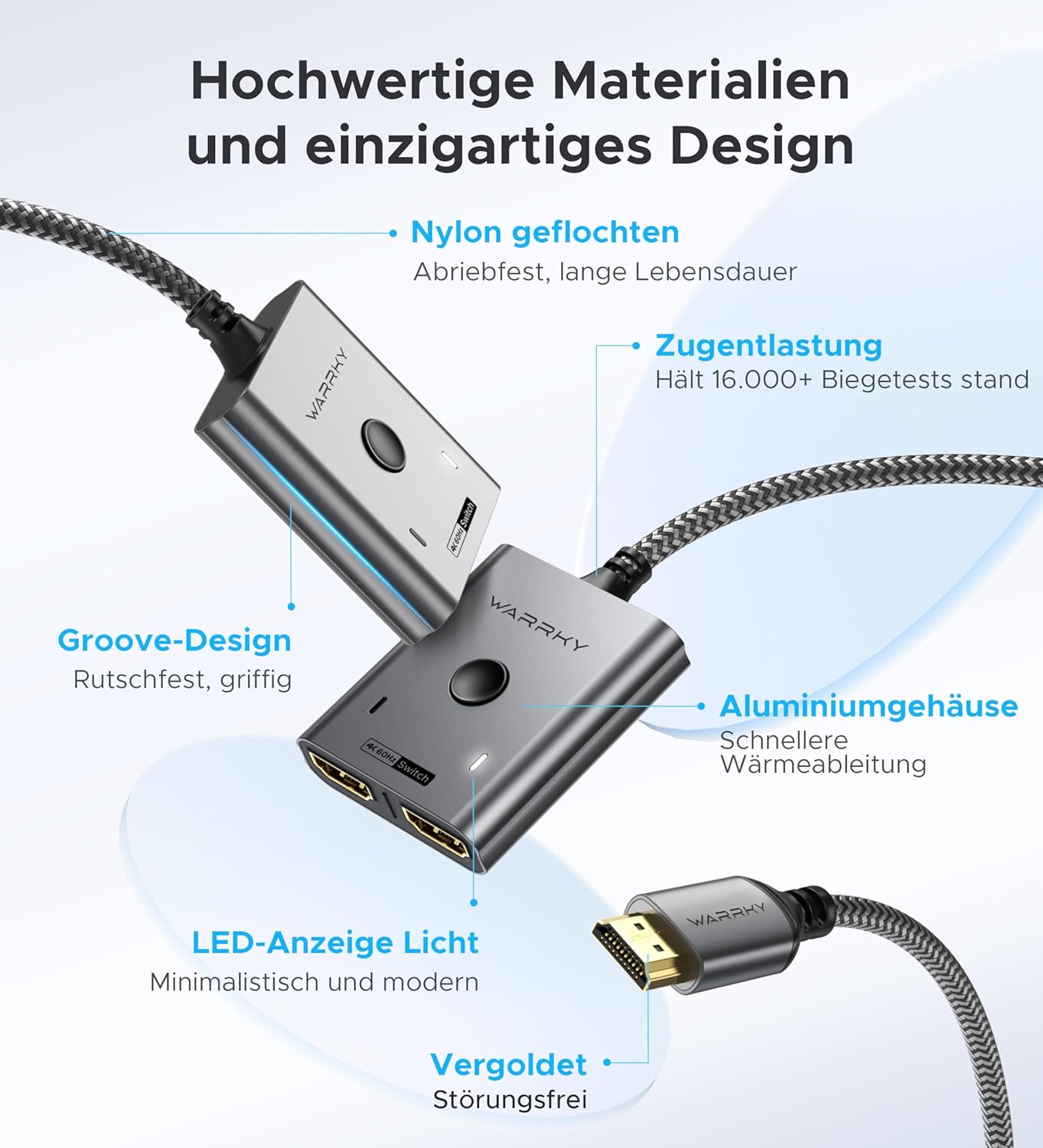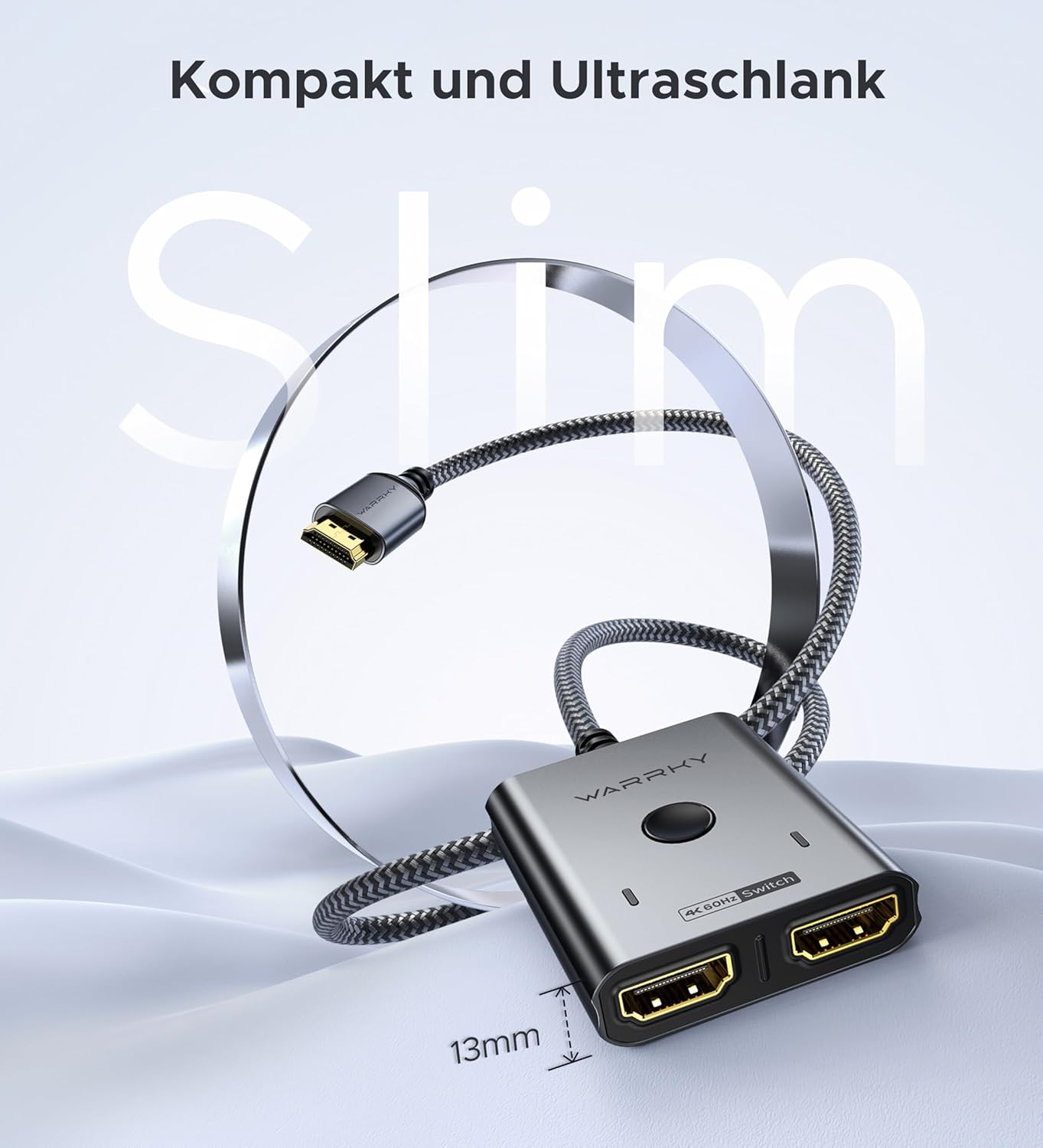 HDMI превключвател 4K @ 60Hz, WARRKY HDMI 2.0 сплитер 2 входа 1 изход 【2K @ 144Hz, 1 м оплетен кабел, HDCP 2.2】 Алуминиев превключвател (1 дисплей едновременно) Поддържа UHD 3D за PS5/4, Xbox, FireStick