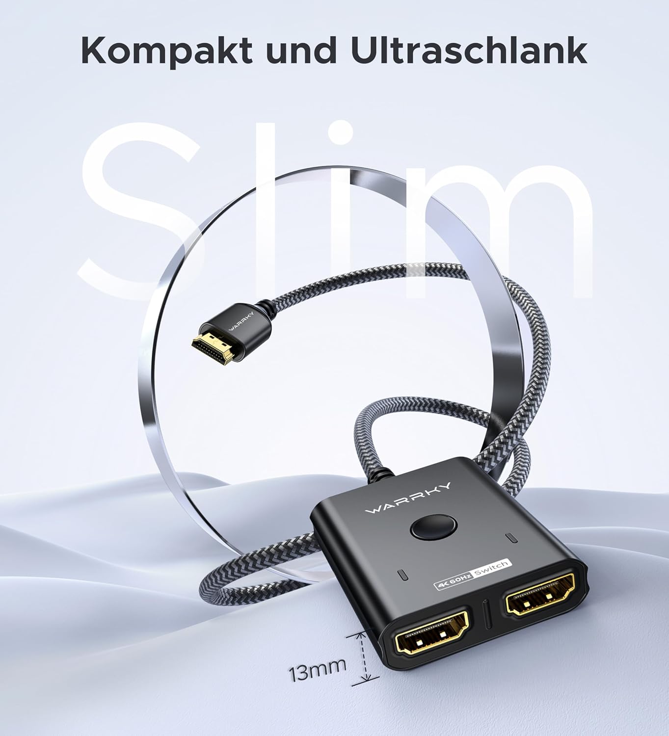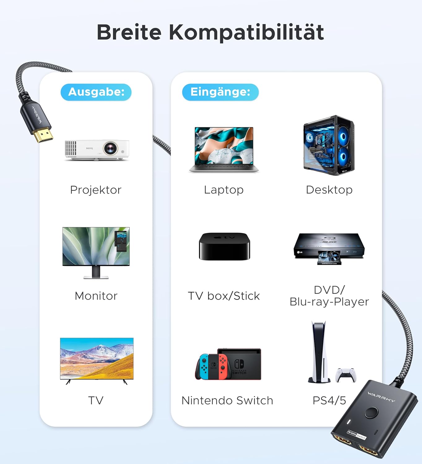 • Универсална съвместимост: Този 1 към 2 HDMI двоен щепсел е plug and play, съвместим с повечето устройства със стандартен HDMI интерфейс (не за ARC, eARC): PlayStation 3 / 4 / 5, Xbox One / Series / 360, Nintendo Switch, Roku, Chromecast, Fire Stick, лаптоп и др. Дисплеи: UHD / FHD / HD телевизори, монитори, проектори и други.