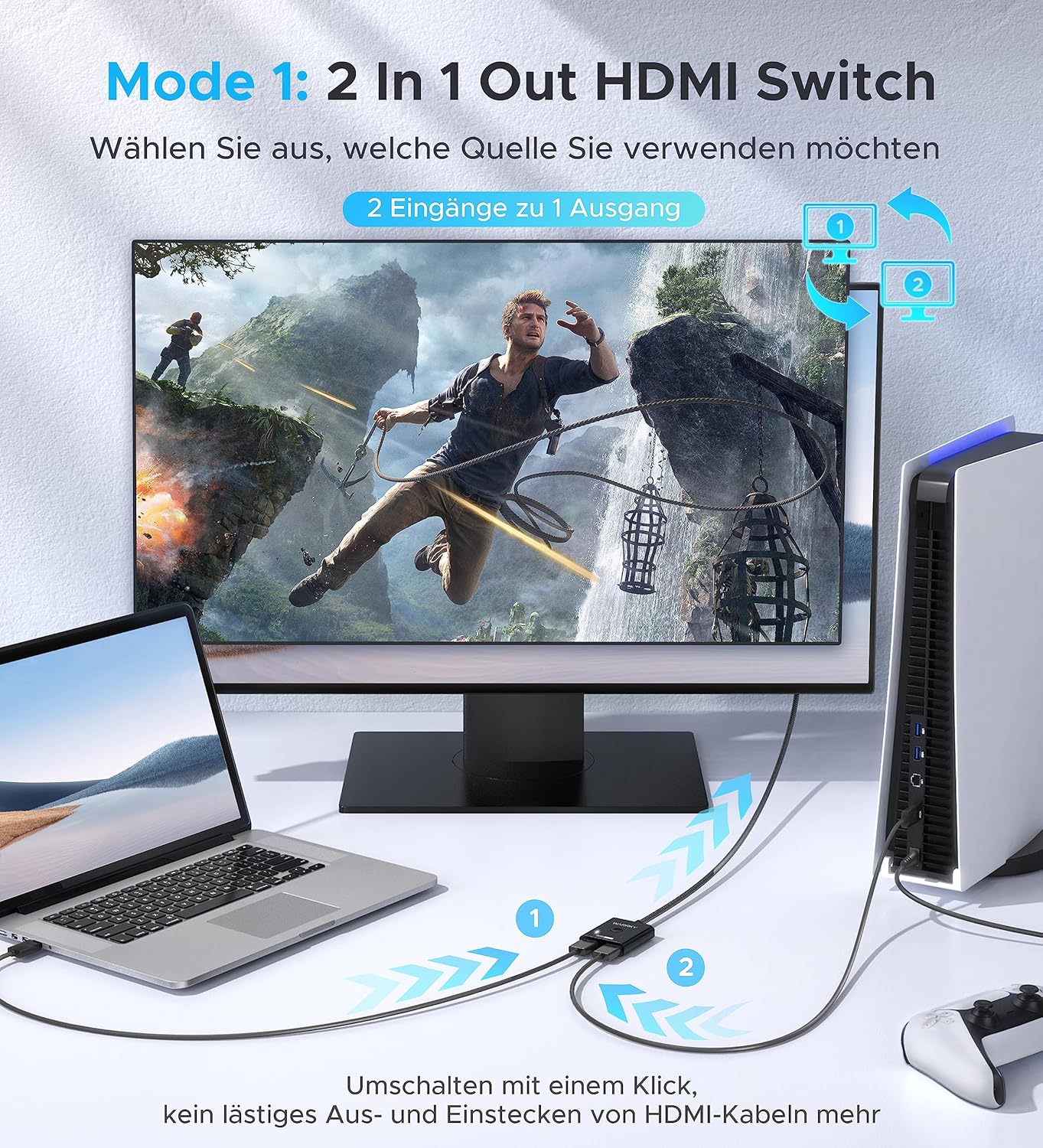 • До 4K 60Hz, Plug & Play: Двупосочен HDMI сплитер с 2 режима: режим 1 (превключване на източници): свържете мъжкия HDMI жак към 1 дисплей и HDMI жака към 2 HDMI източника и след това превключвайте между източниците на един дисплей. Режим 2 (превключване на дисплеи): Свържете мъжкия HDMI жак към 1 източник и превключвайте между 2 дисплея (ЗАБЕЛЕЖКА: САМО един от 2 дисплея ще работи едновременно, не можете да показвате две устройства едновременно).