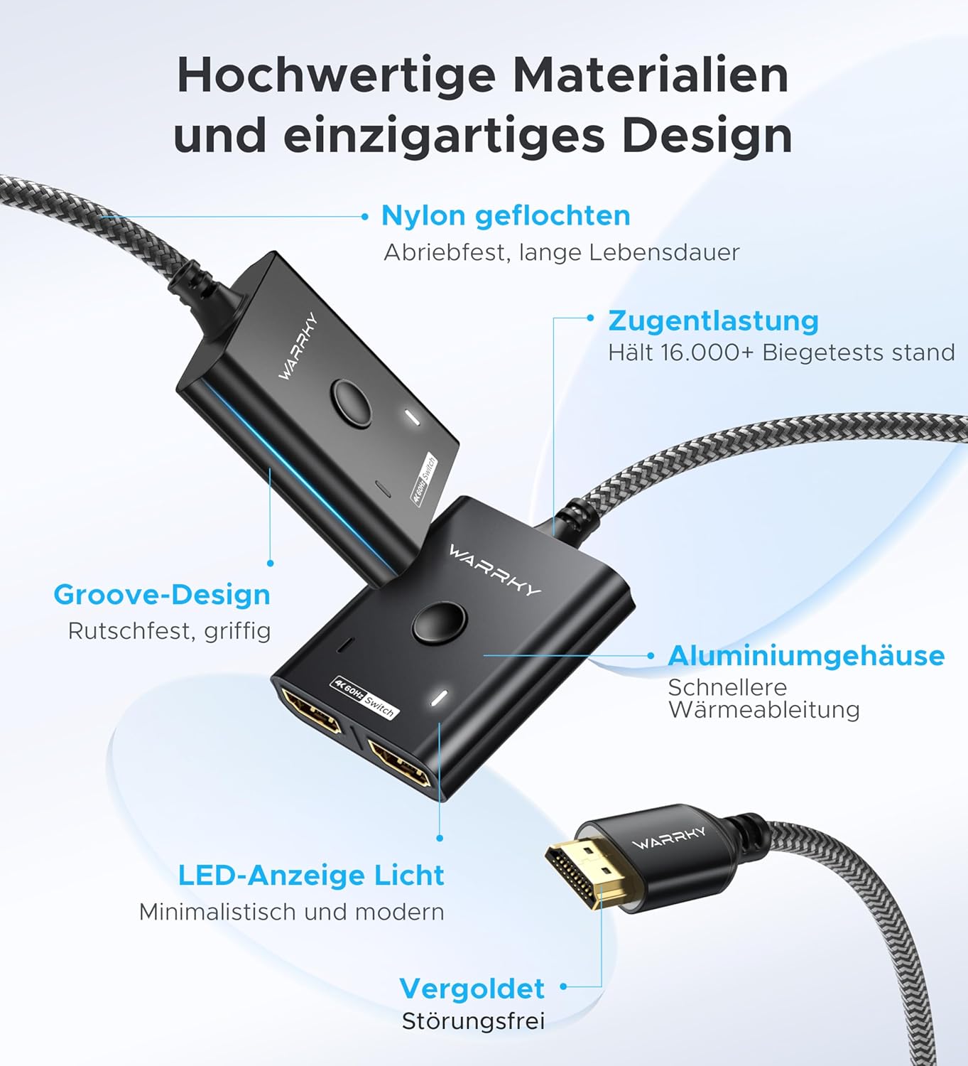 HDMI превключвател 4K @ 60Hz, WARRKY HDMI сплитер 2 входа 1 изход (1 дисплей едновременно) 3.3 фута оплетен кабел, алуминиев корпус, HDCP 2.2 2 към 1 превключвател поддържа UHD за PS5/4 - черен