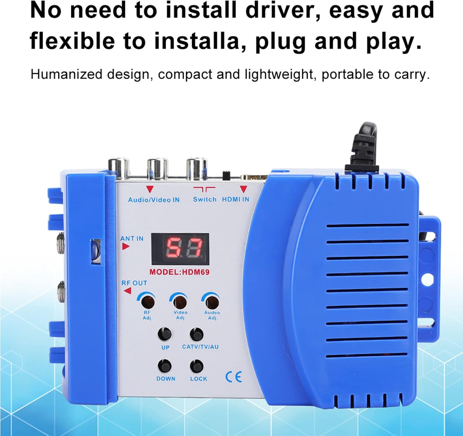 Компактен и преносим: С лесен за употреба дизайн, този конвертор е компактен и лек, което го прави лесен за носене със себе си, където и да отидете. Независимо дали пътувате или сте в движение, този модулатор е удобно решение за всички ваши аудио/видео нужди.