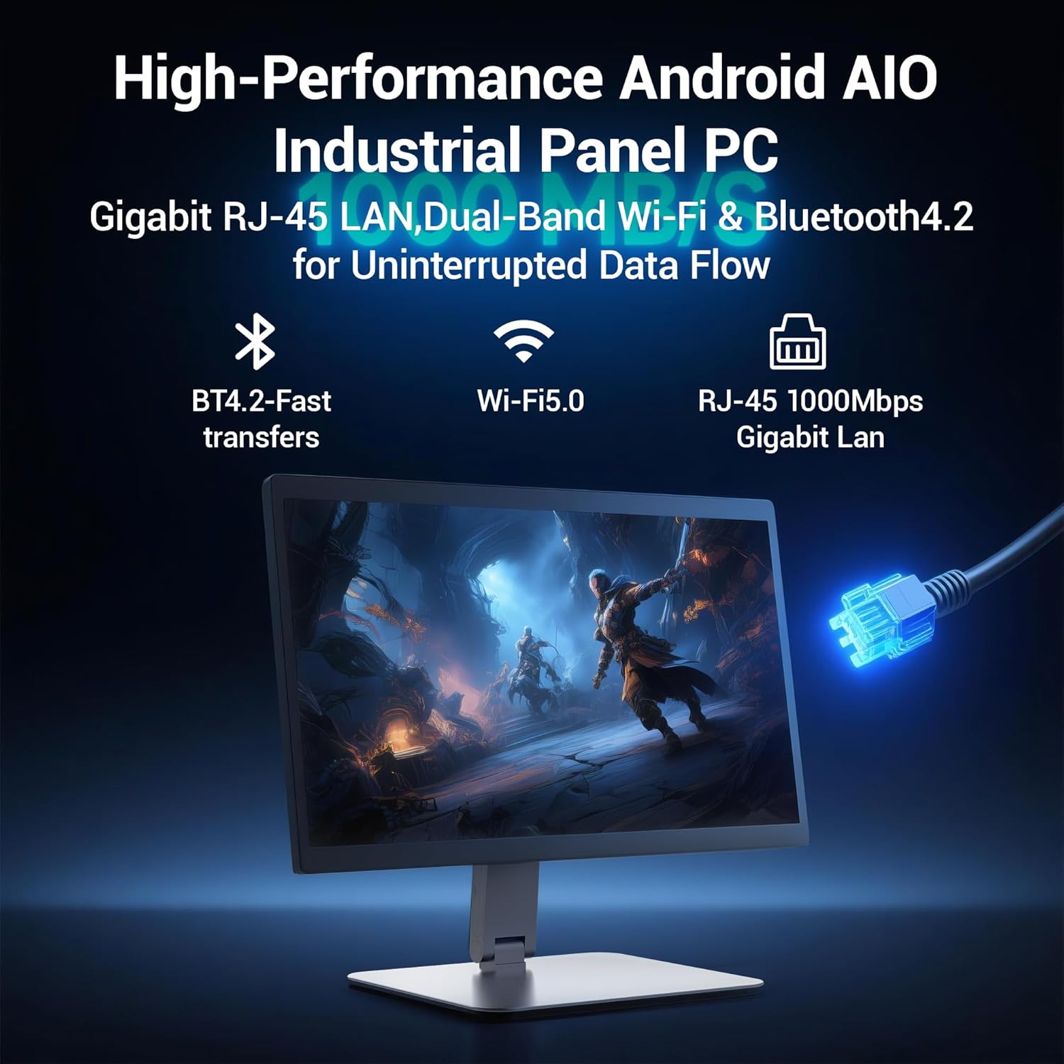 • Индустриален компютър с високоскоростна безжична връзка – Този индустриален компютър със сензорен екран разполага с високоскоростен Wi-Fi 5 за значително подобрено приемане на сигнала. Вграденият Bluetooth 4.2 осигурява по-ниска латентност, стабилно предаване и разширен обхват, а 1000M LAN портът осигурява безпроблемна свързаност във всяка среда.
