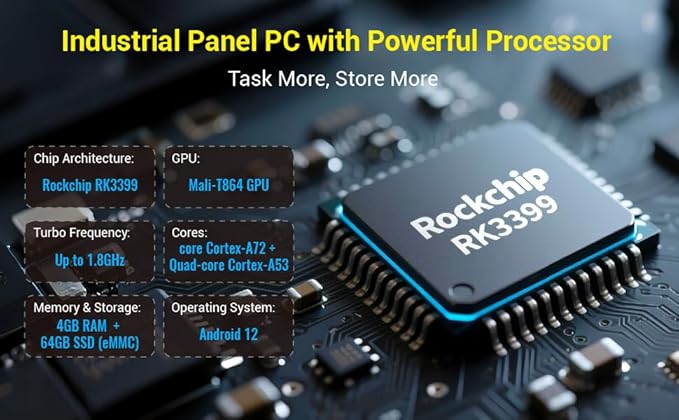 • Индустриален панелен компютър с Android 12 – Захранван от процесор RK3399 и Android 12, този 15,6-инчов панелен компютър със сензорен екран съчетава висока надеждност с безшумна работа, което го прави идеален за тежки индустриални условия. 4GB RAM и 64GB ROM осигуряват безпроблемна многозадачност и обработка на данни.