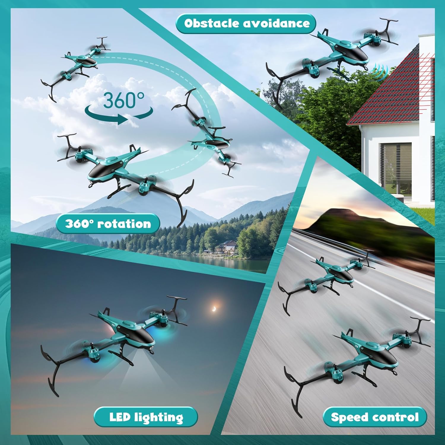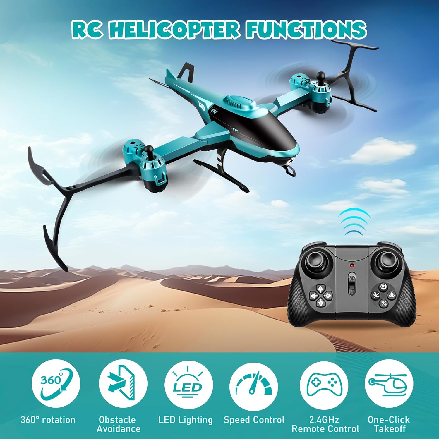 • 360° ролкови завъртания: благодарение на усъвършенстваната технология за ролкови завъртания, 360° завъртания могат да се изпълняват във въздуха с натискане на бутон, както и да се стартират и връщат. Функцията за плаване осигурява стабилно плаване във въздуха. Скоростта на полета се регулира на три нива, в зависимост от нивото на опит. Благодарение на защитеното от падане шаси, предпазния капак и високоздравите витла, дори начинаещите могат бързо да овладеят технологията на полета.