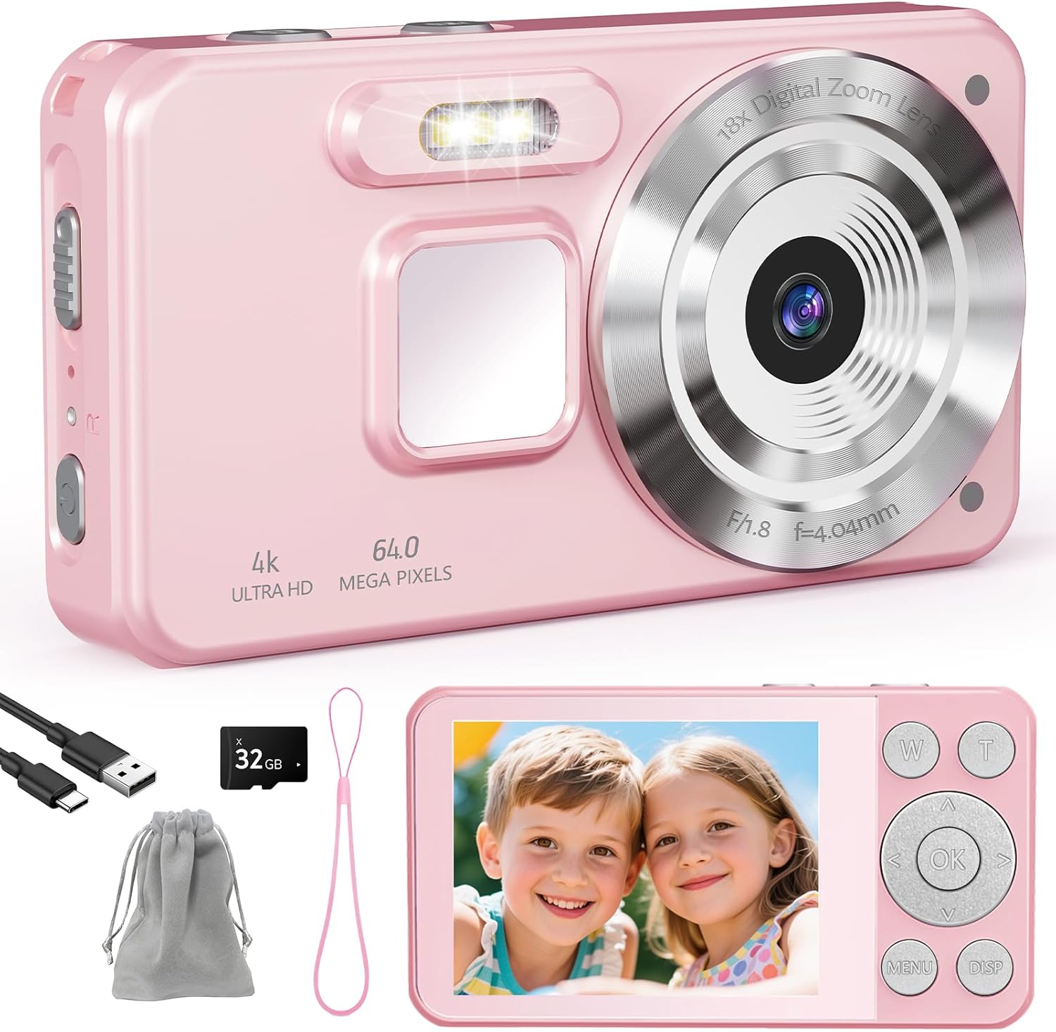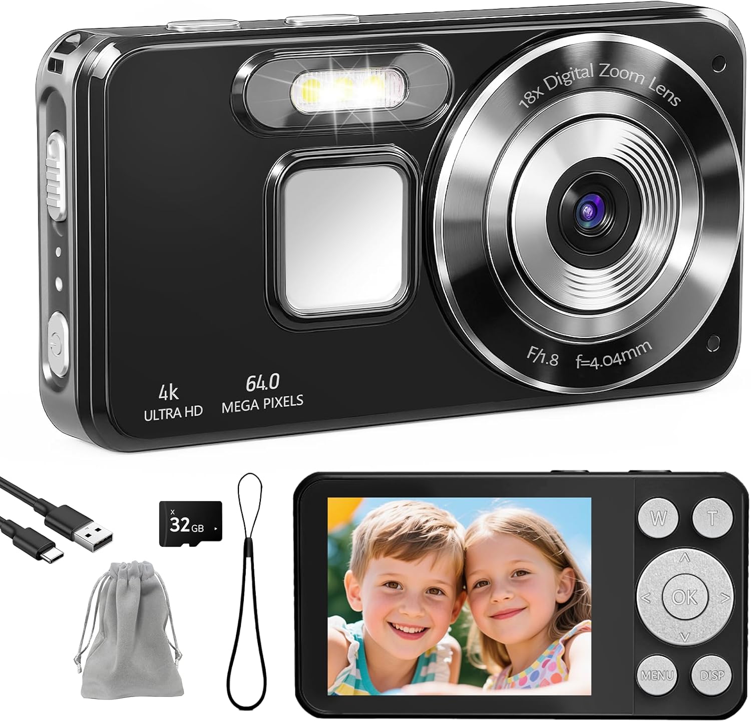HERBYD Цифрова камера 4K Фотоапарат 64MP Камера Преносима компактна камера с 2.8-инчов LCD екран, 18X цифрово увеличение, 32GB SD карта, 1 връзка за деца, тийнейджъри, начинаещи (черна)