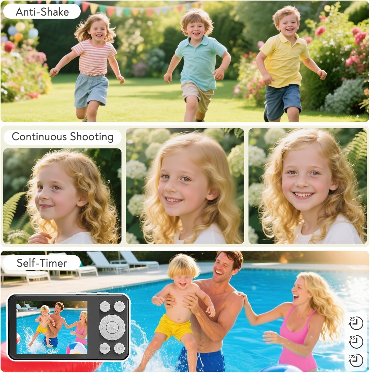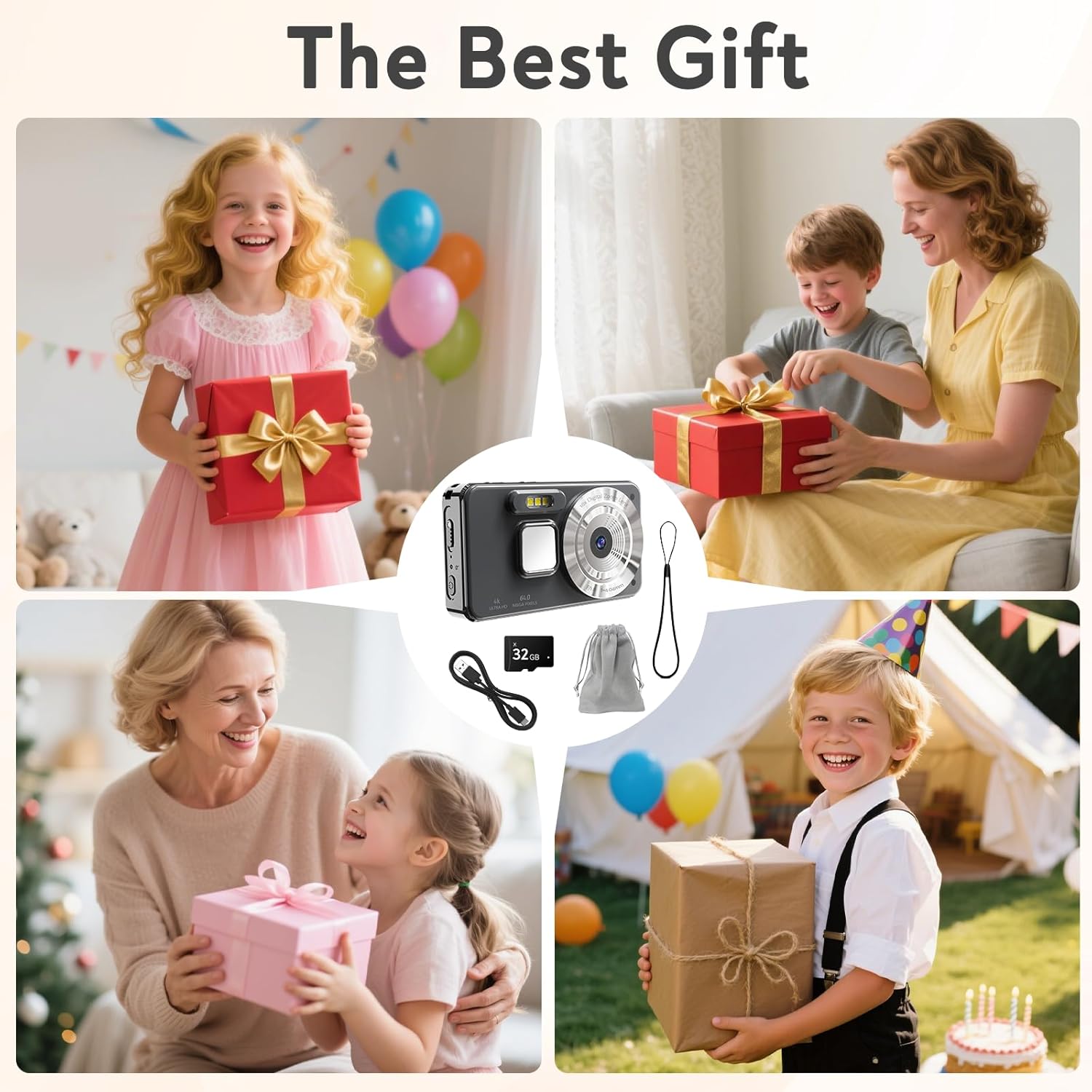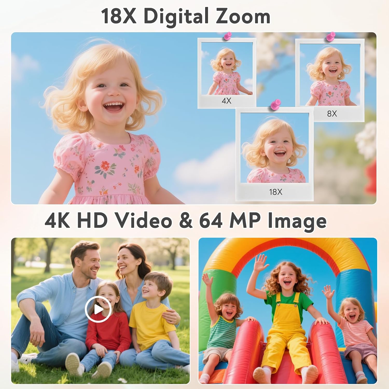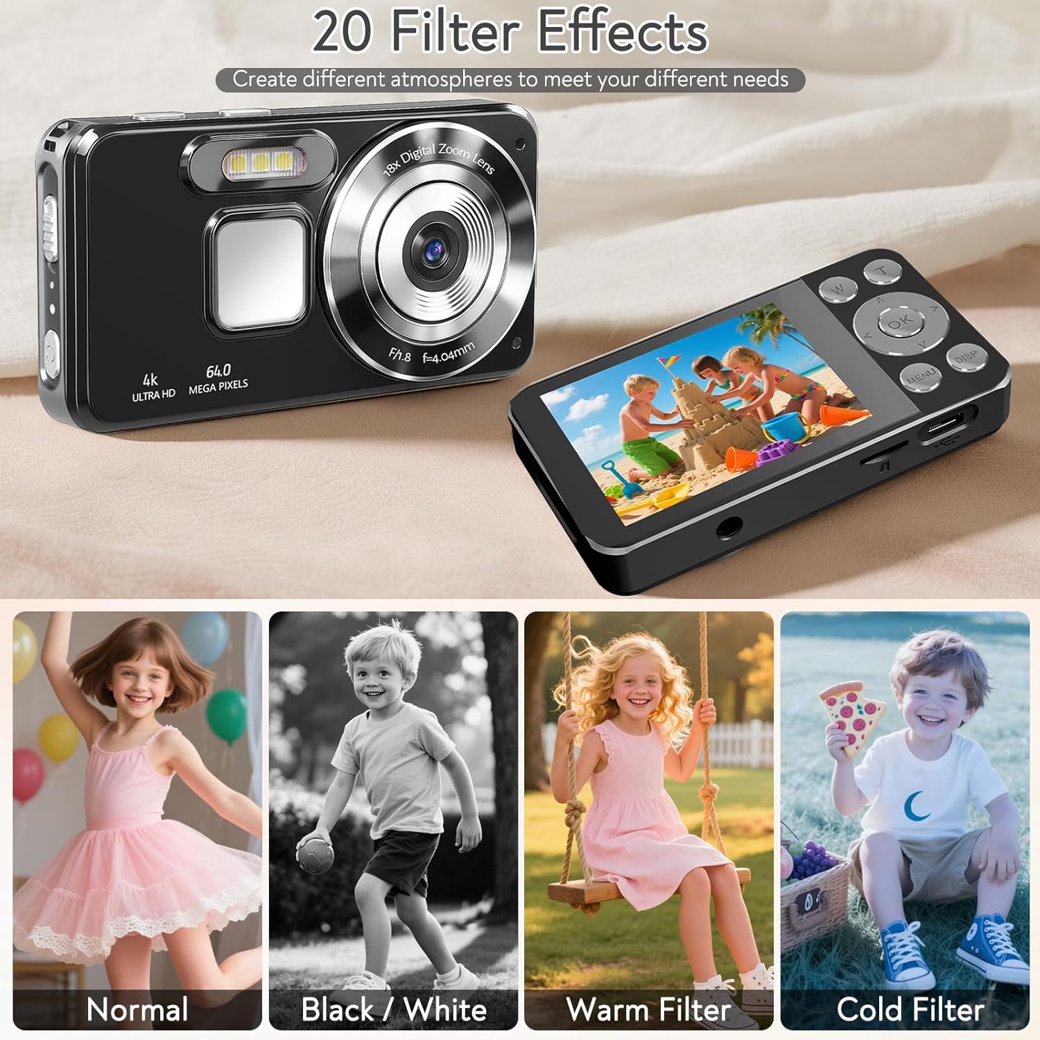 HERBYD Цифрова камера 4K Фотоапарат 64MP Камера Преносима компактна камера с 2.8-инчов LCD екран, 18X цифрово увеличение, 32GB SD карта, 1 връзка за деца, тийнейджъри, начинаещи (черна)