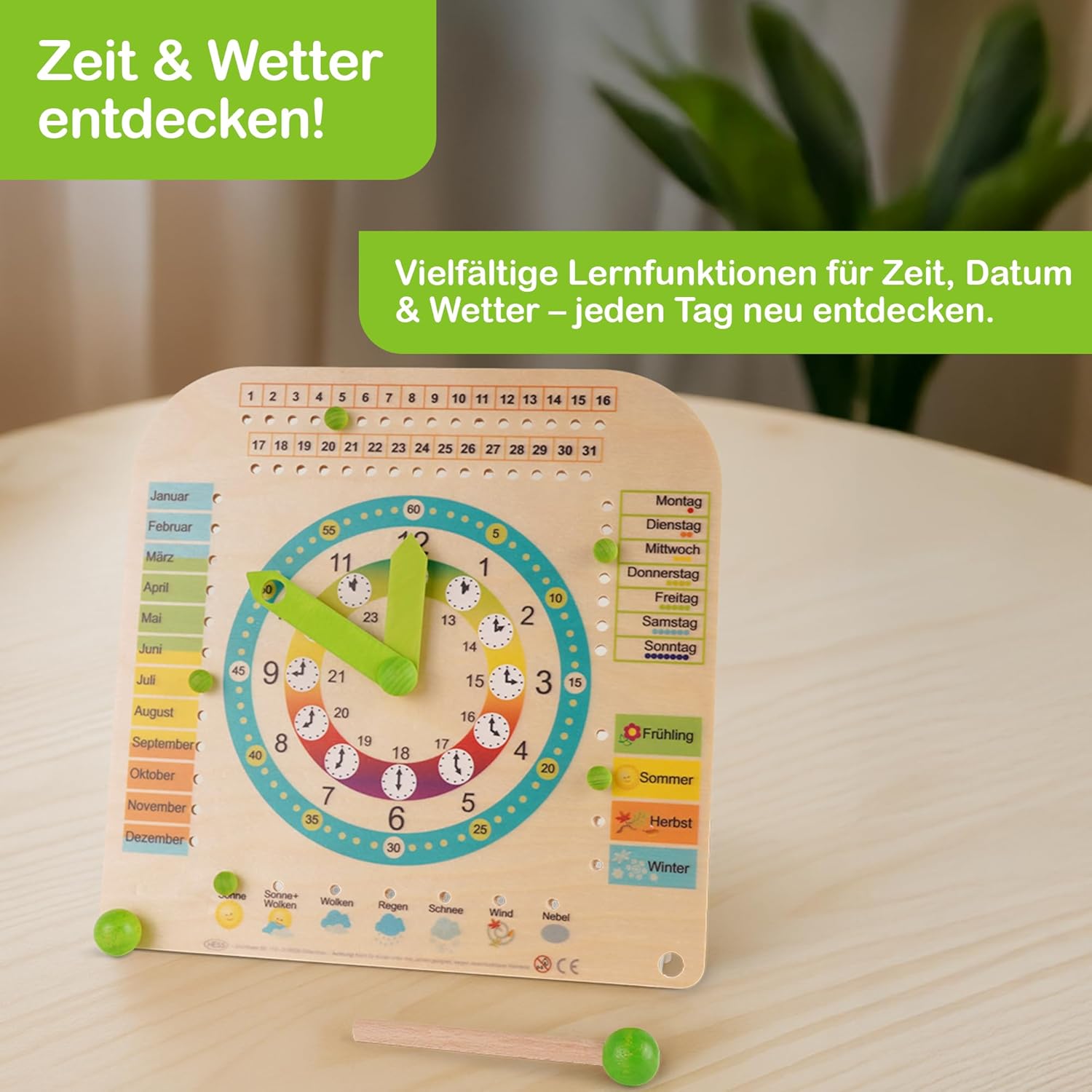 Дървени играчки Hess – гарантирано ще доставят радост на децата. Този стоящ учебен часовник за деца над 3 години е с размери приблизително 25 x 25 см и е изработен от дърво. С този цветен часовник вашето дете може игриво да учи за сезоните, месеците, дните от седмицата, часа и времето. Независимо дали е голям или малък – играчките Hess са просто задължителни.