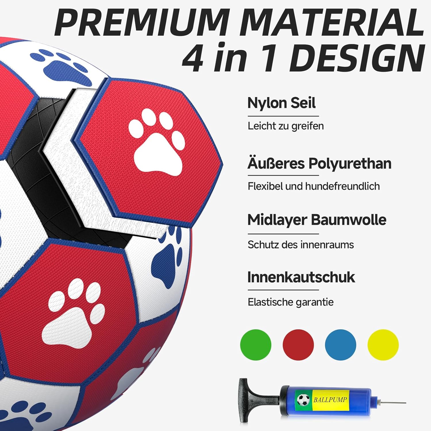 • Премиум материал: Външният слой, изработен от екологично чист полиуретанов (PU) материал, средният слой, изработен от памучна прежда, и подплатата от естествен каучук съставляват тази първокласна топка за кучета, която отговаря на всички очаквания по отношение на висока еластичност и пригодност за дългосрочна употреба.