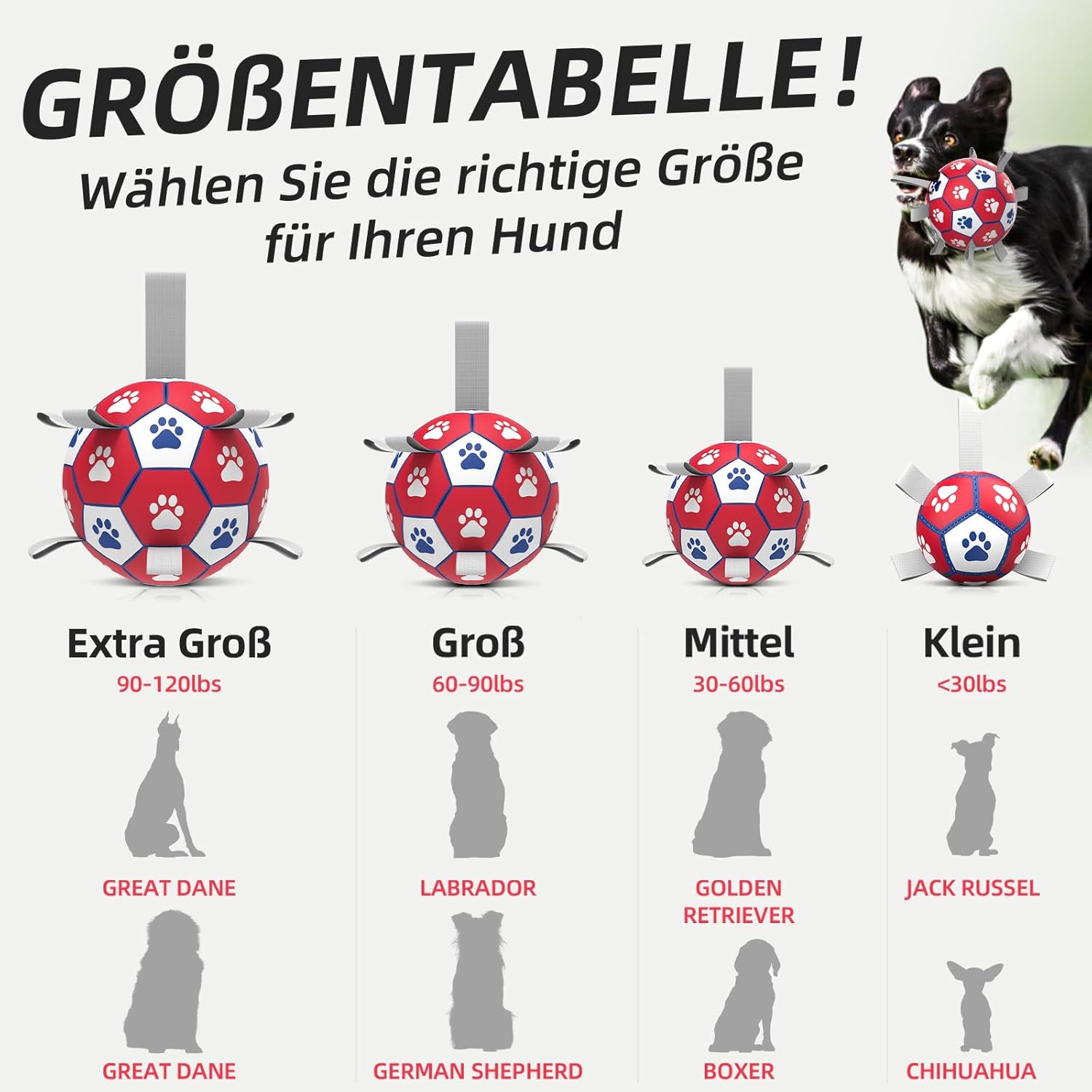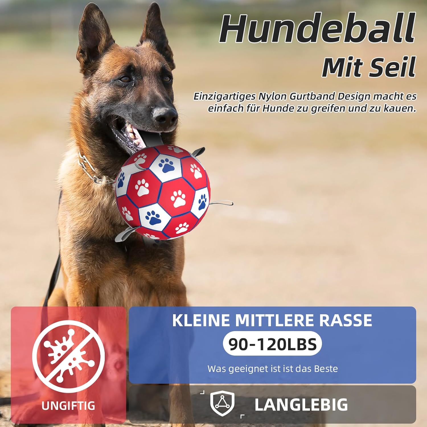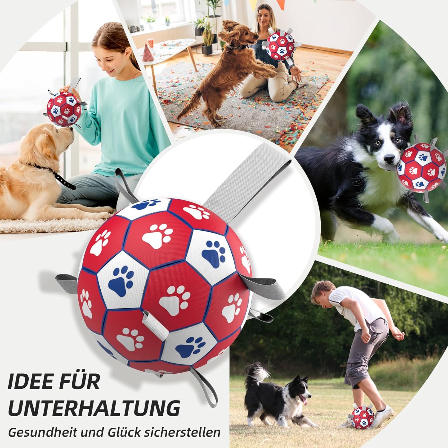 • Топка за кучета с презрамки: Найлоновата каишка на топката осигурява радост както за любителите на кучета, така и за техните космати приятели. Можете да играете игри на дърпане на въже, гонене или изследване и, разбира се, много други нови възможности за игра ви очакват да бъдат отключени от вас.
