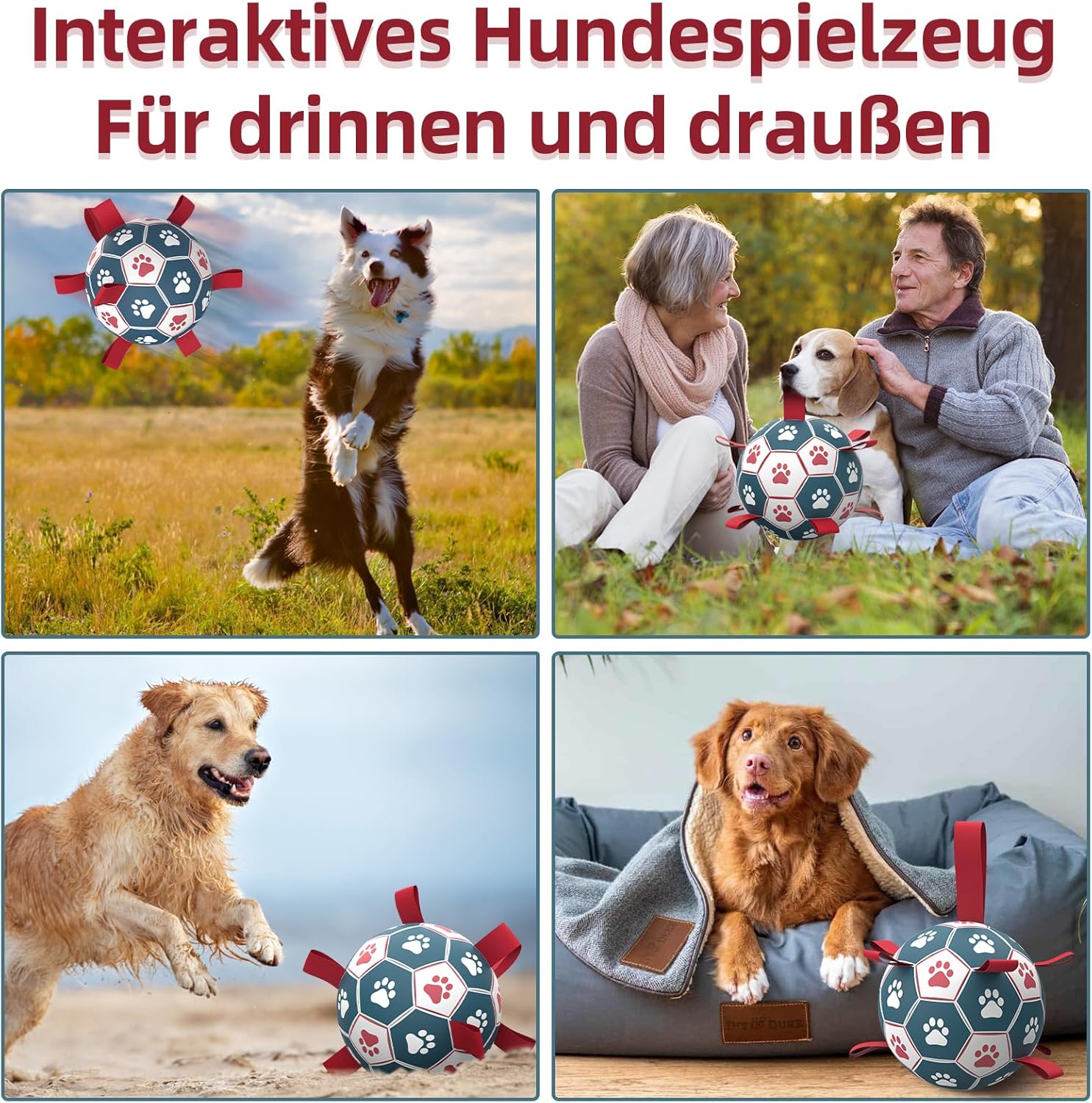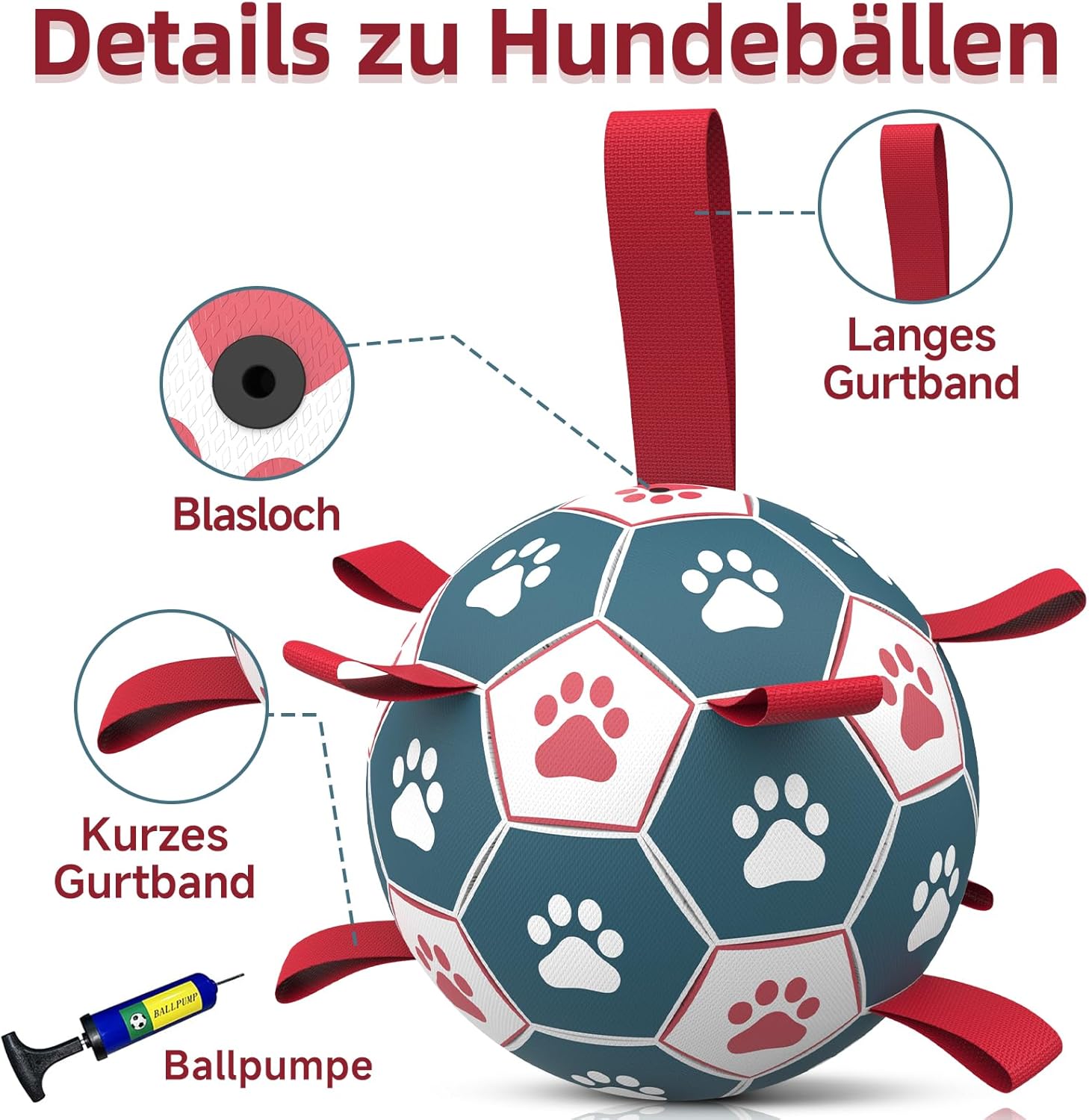 • Топка за кучета с презрамки: Найлоновата каишка на топката осигурява радост както за любителите на кучета, така и за техните космати приятели. Можете да играете игри на дърпане на въже, гонене или изследване и, разбира се, много други нови възможности за игра ви очакват да бъдат отключени от вас.