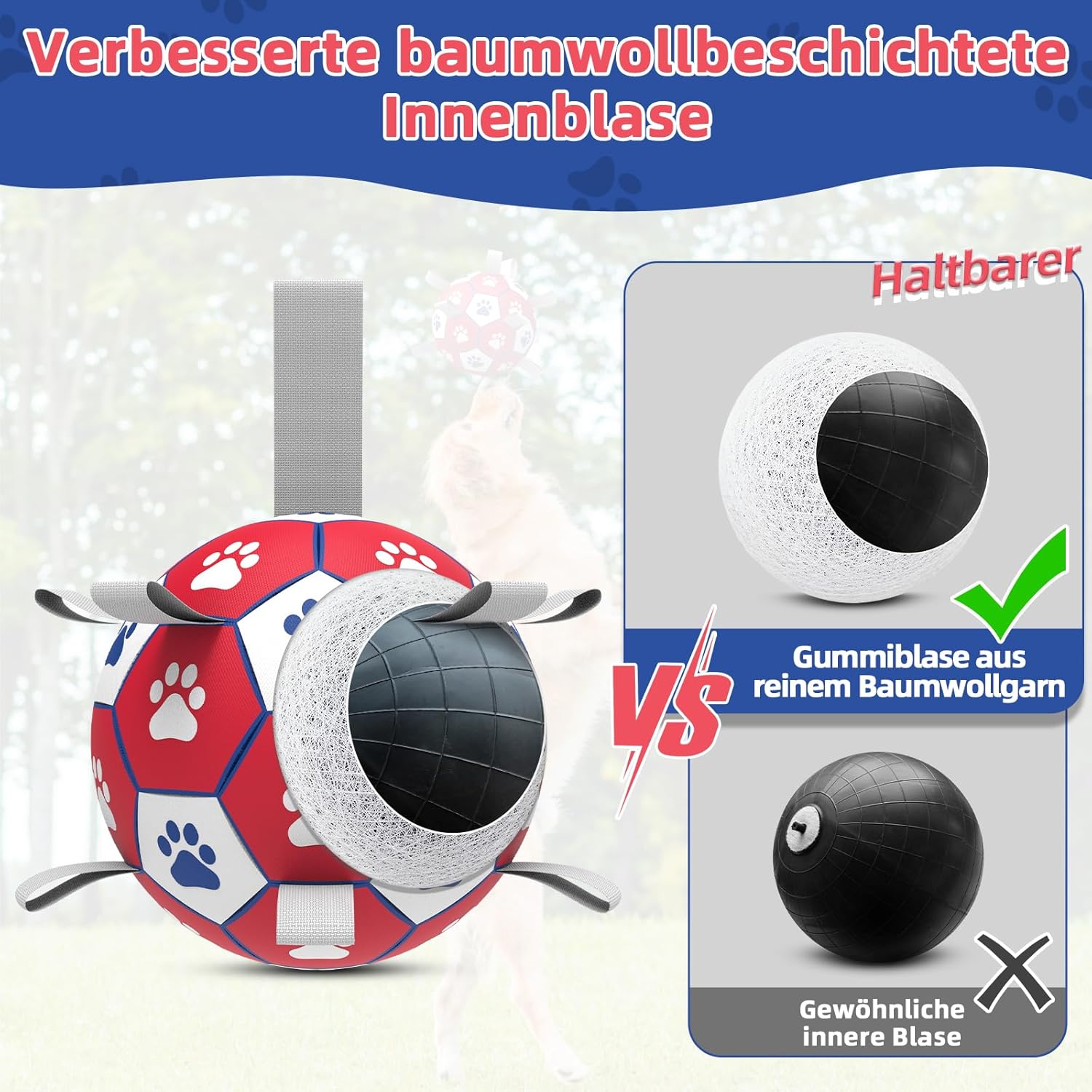 • Топка за кучета с презрамки: Найлоновата каишка на топката осигурява радост както за любителите на кучета, така и за техните космати приятели. Можете да играете игри на дърпане на въже, гонене или изследване и, разбира се, много други нови възможности за игра ви очакват да бъдат отключени от вас.
