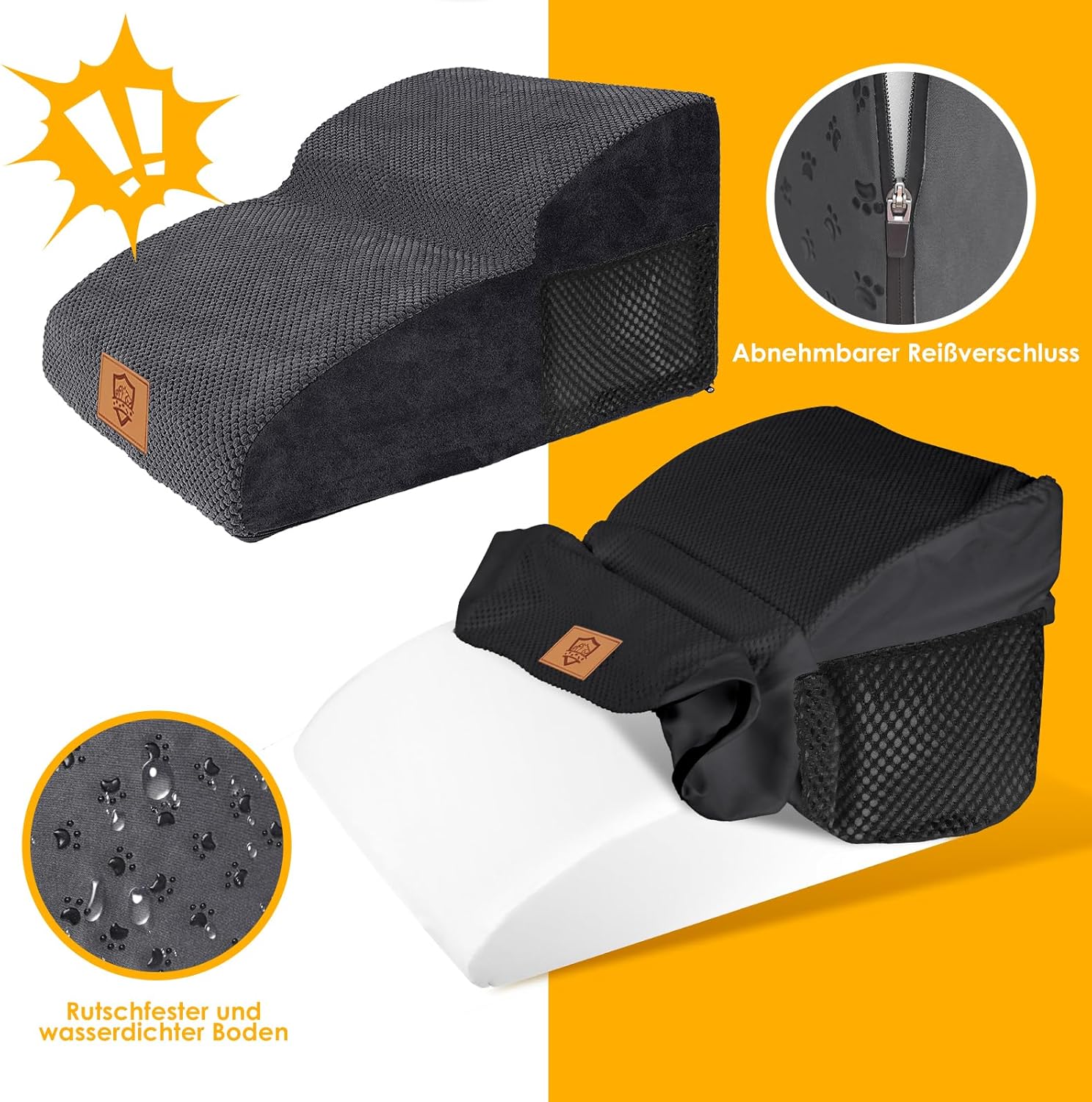 • - Водоустойчива и противоплъзгаща: Повърхността на стълбата за катерене за домашни любимци е изработена от кадифе, а долната част има противоплъзгащи силиконови точки. Двойният противоплъзгащ дизайн предотвратява подхлъзване на домашния любимец по време на употреба, което я прави по-безопасна и по-надеждна. Подплатата на материала е водоустойчива. Това предотвратява замърсяването на пяната, така че е необходимо да почиствате само повърхността на калъфа.
