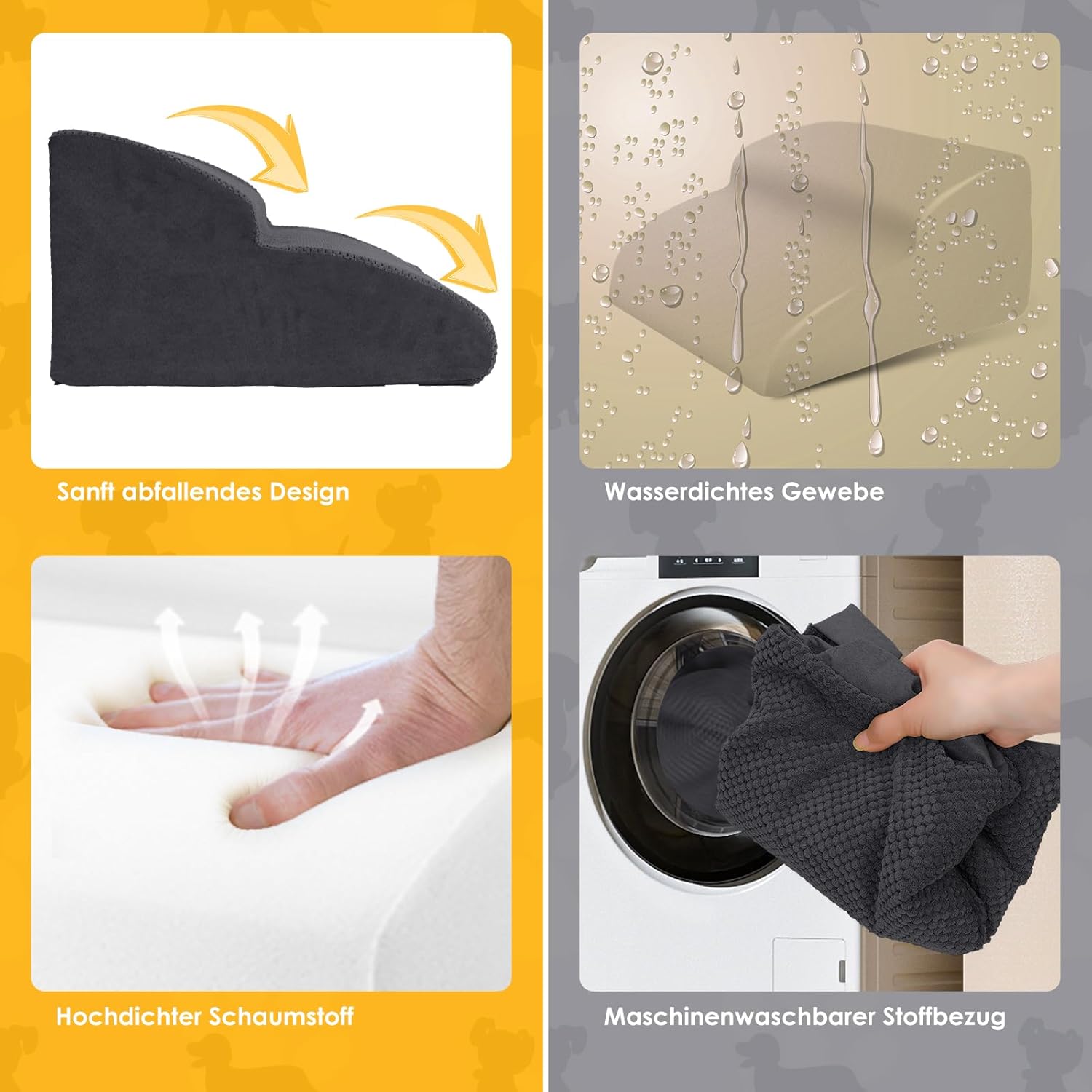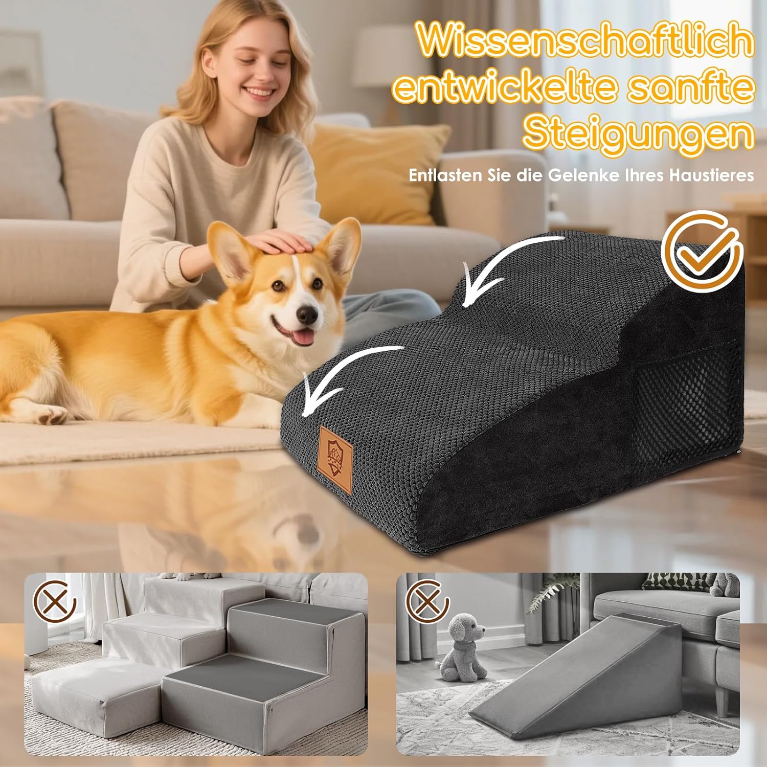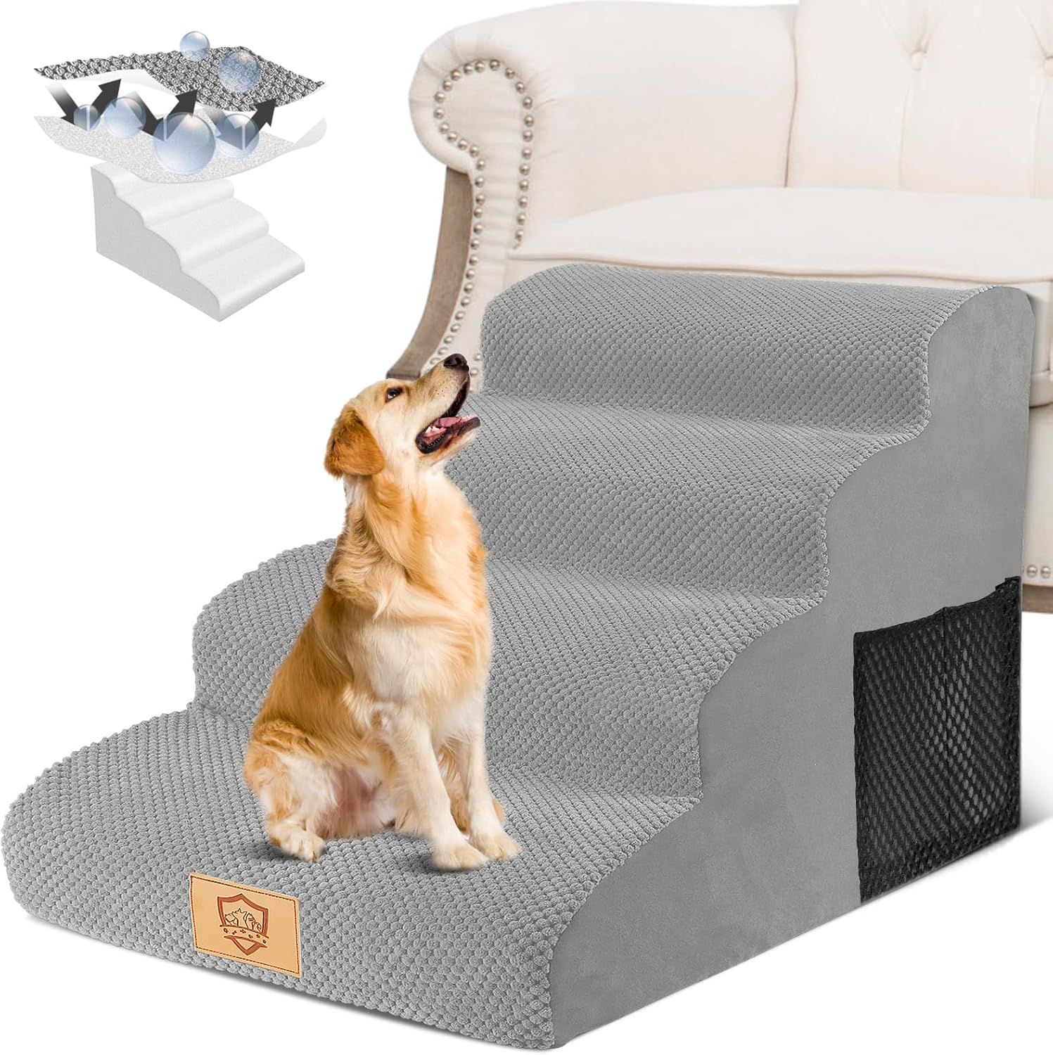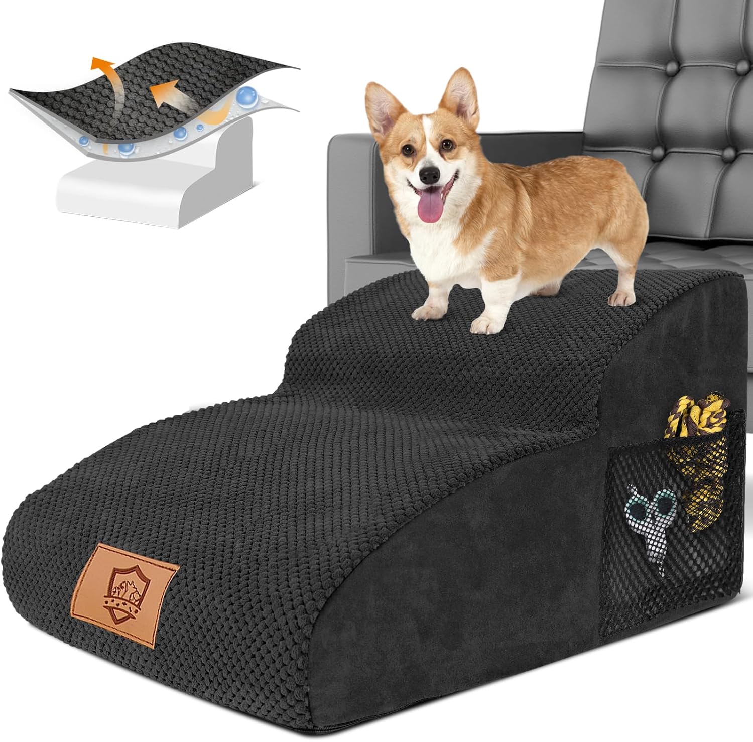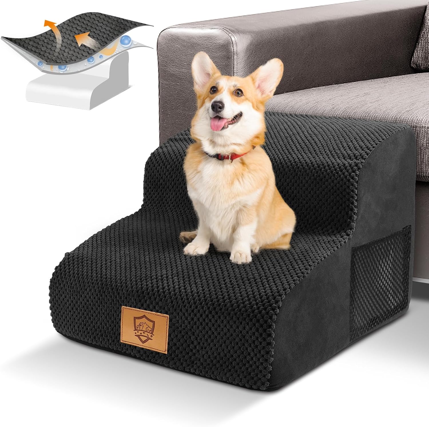 HEVOL 2-стъпаловидна стълба за домашни любимци, подвижна рампа за кучета с миещ се калъф, стълба за кучета за малки кучета, стълба за котки за диван, легло, включва 1x валяк за мъх
