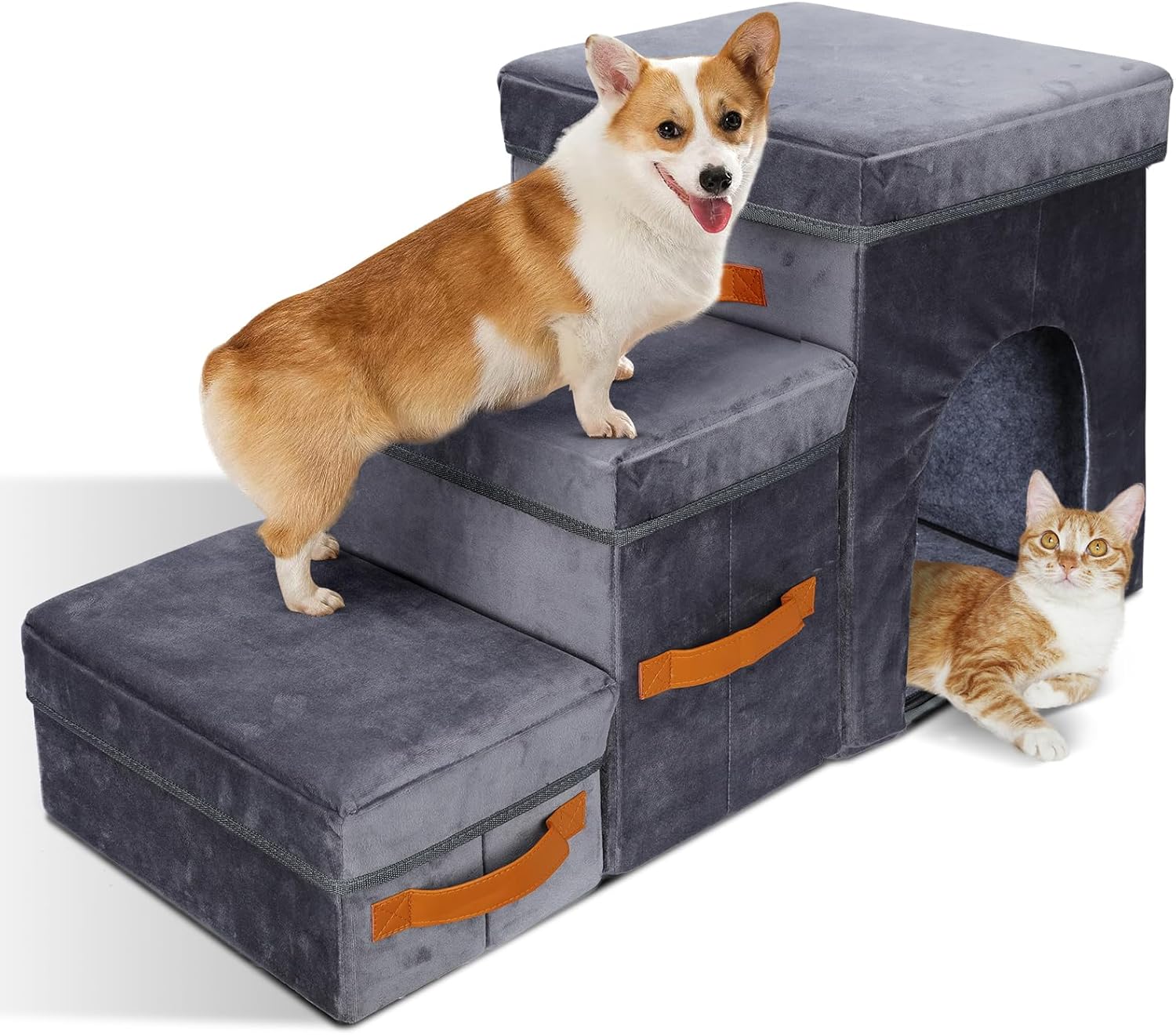 • Удобна и стабилна: Стълбата за домашни любимци е с размери 60 x 40 x 40 см и може да помогне на вашия домашен любимец да достигне по-високи места. Тя има голяма и стабилна основа, така че не е нужно да се притеснявате, че ще се преобърне. Повърхността на стълбата за катерене е изработена от кадифе и велур, така че е мека и удобна. Стълбата е лека, така че е лесна за преместване и носене и е най-добрият избор за вас и вашия домашен любимец у дома.