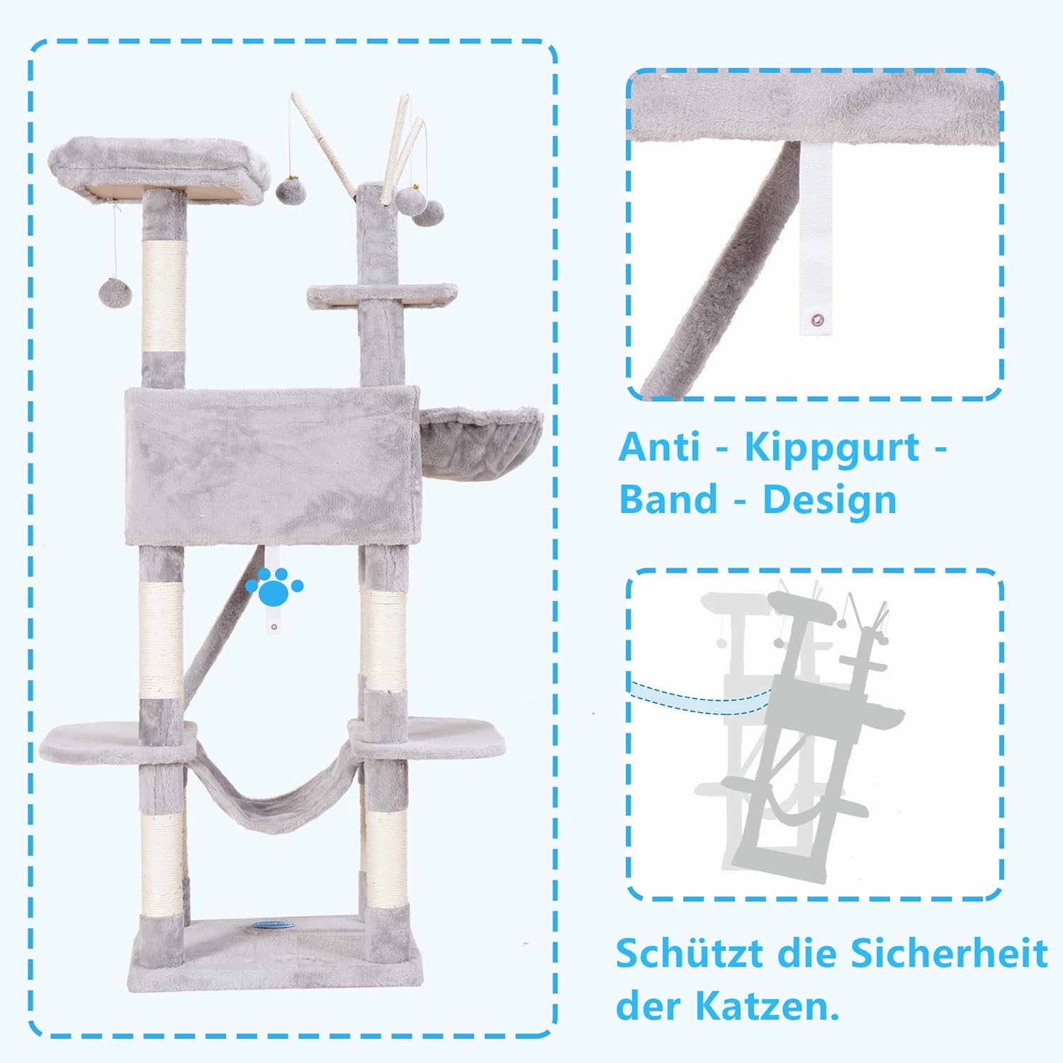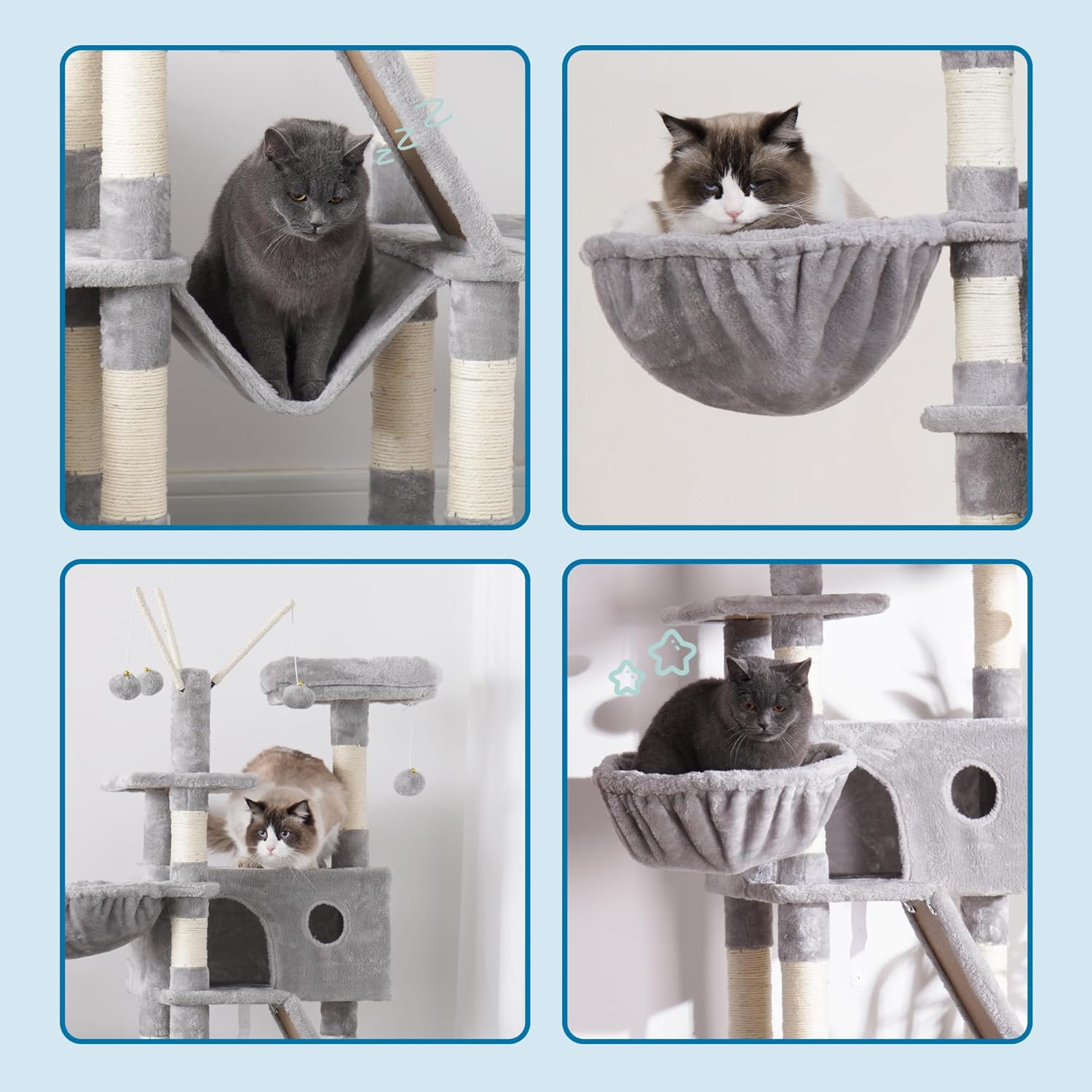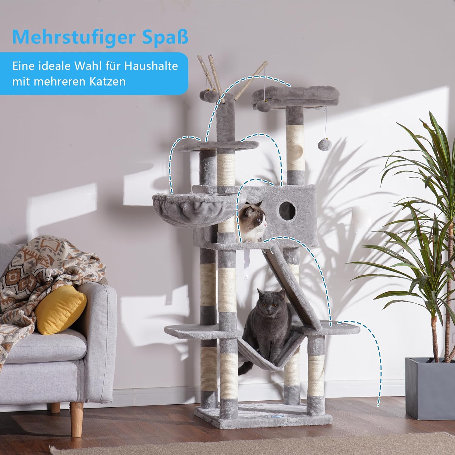 Hey-Brother MPJ019W Дърво за котки за вътрешна употреба 154 см с подплатено легло-платформа, играчка топка, пещери, хамак и къщичка за котки от сизал, светло сиво