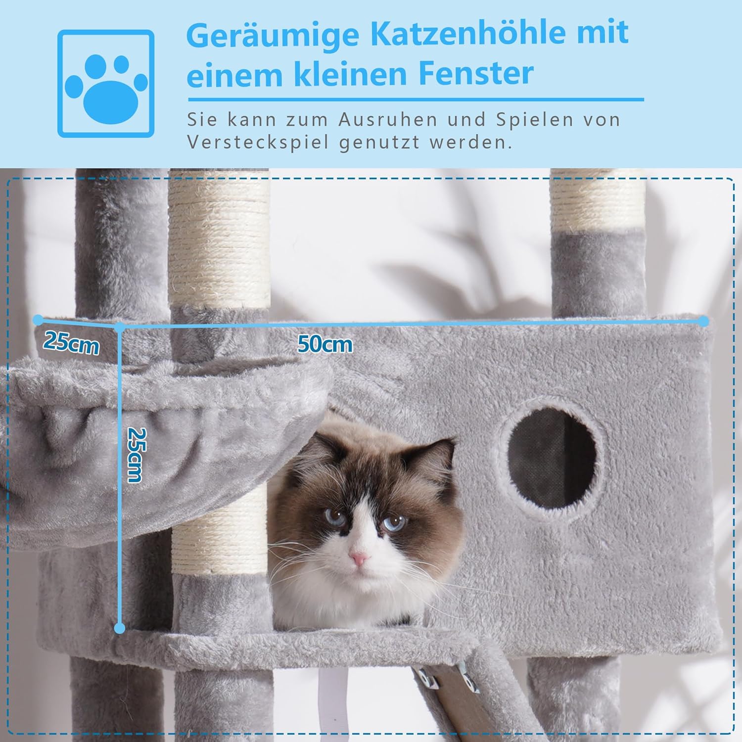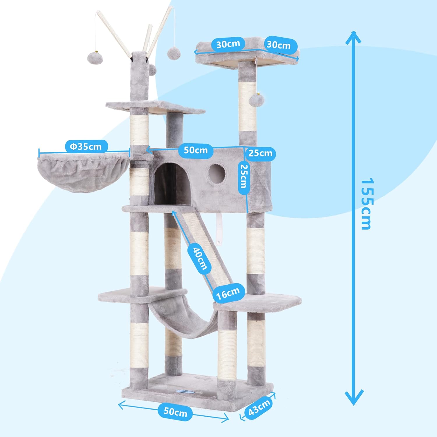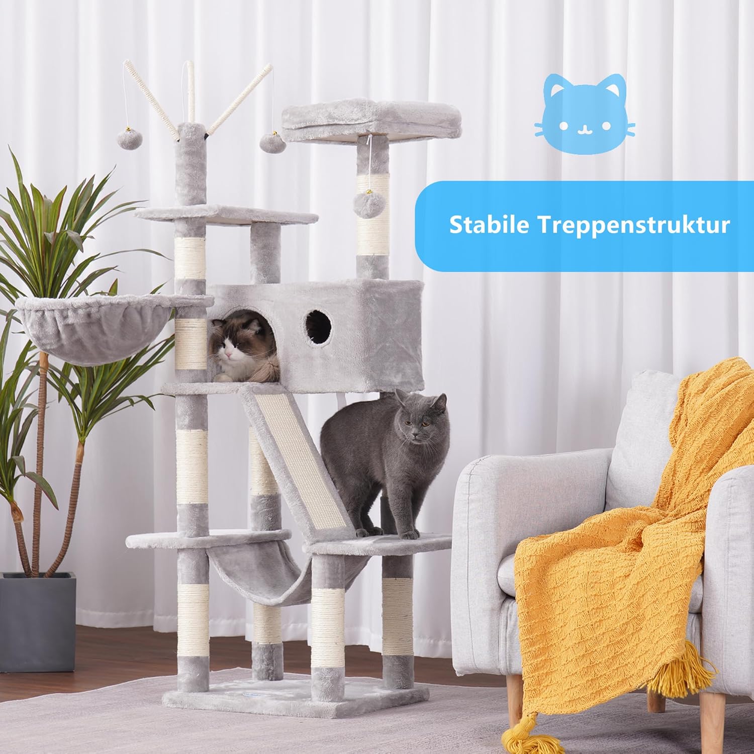 Hey-Brother MPJ019W Дърво за котки за вътрешна употреба 154 см с подплатено легло-платформа, играчка топка, пещери, хамак и къщичка за котки от сизал, светло сиво