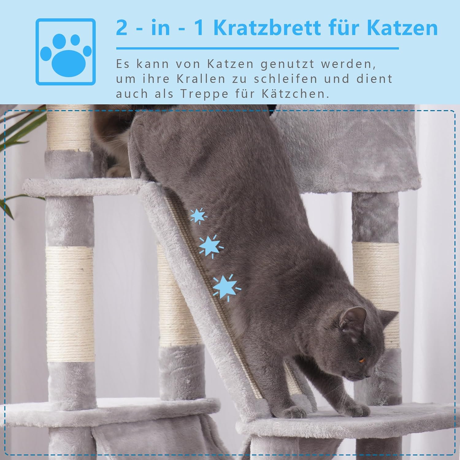 • ВГРАДЕНА ДЪСКА ЗА ДРАСКАНЕ ЗАЩИТАВА МЕБЕЛИТЕ СИ Драскалката за котки е със специално проектиран наклон, който отговаря на нуждите на вашата котка от драскане, като същевременно предпазва мебелите ви от нежелани драскотини