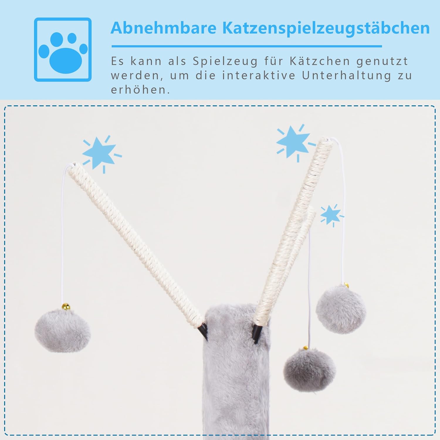 • Интересни интерактивни играчки: на това дърво за котки има подвижни играчки за риболов, пухкави топки и издръжлива сизалова дървесина, които могат да стимулират интереса на котките към играта и да задълбочат взаимодействието.