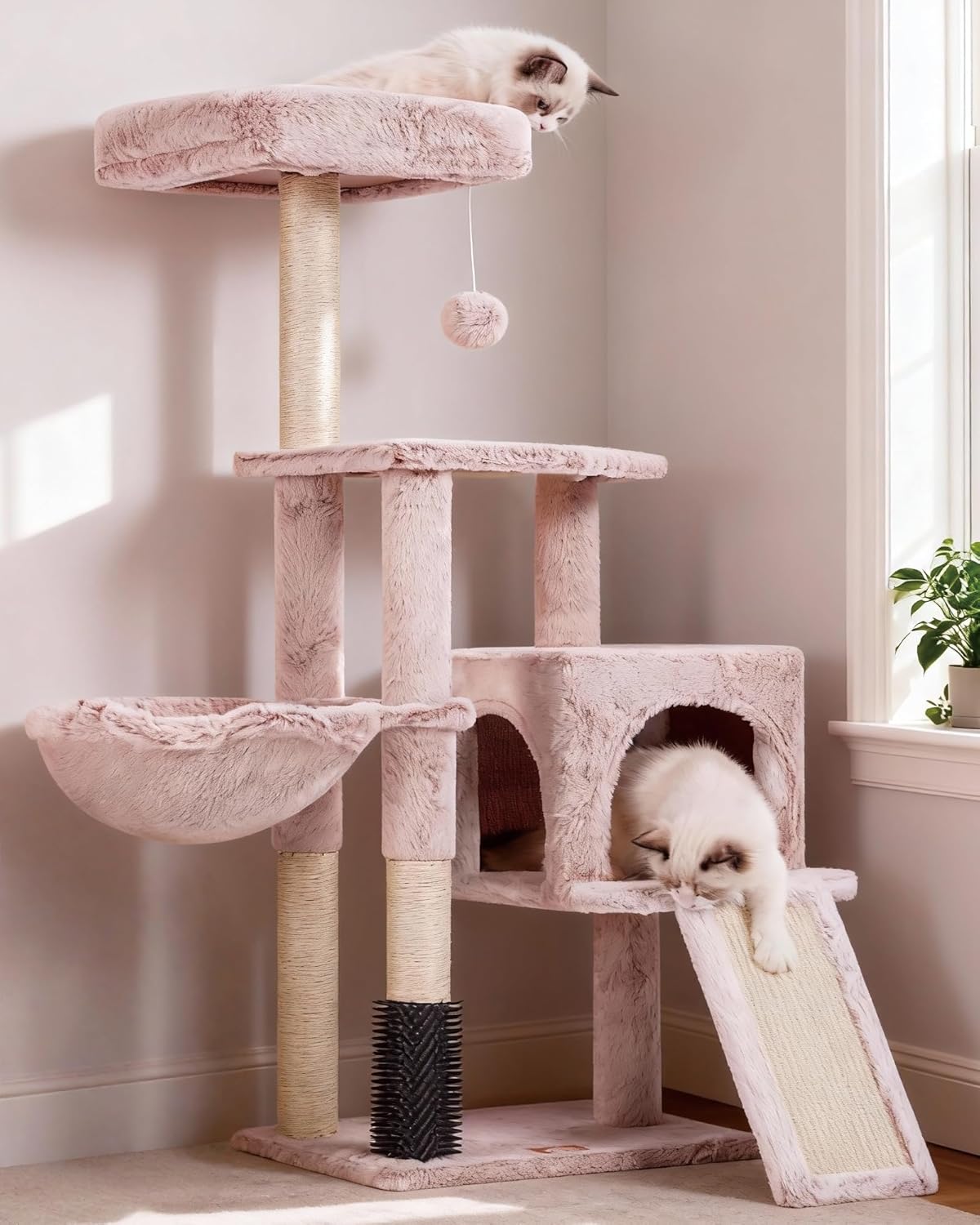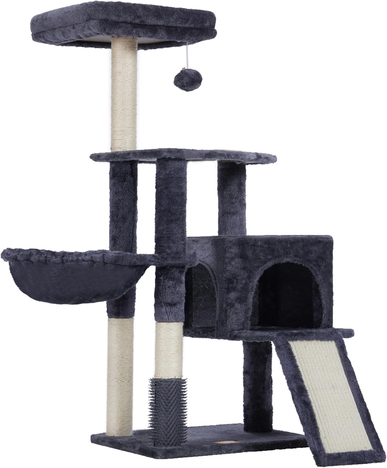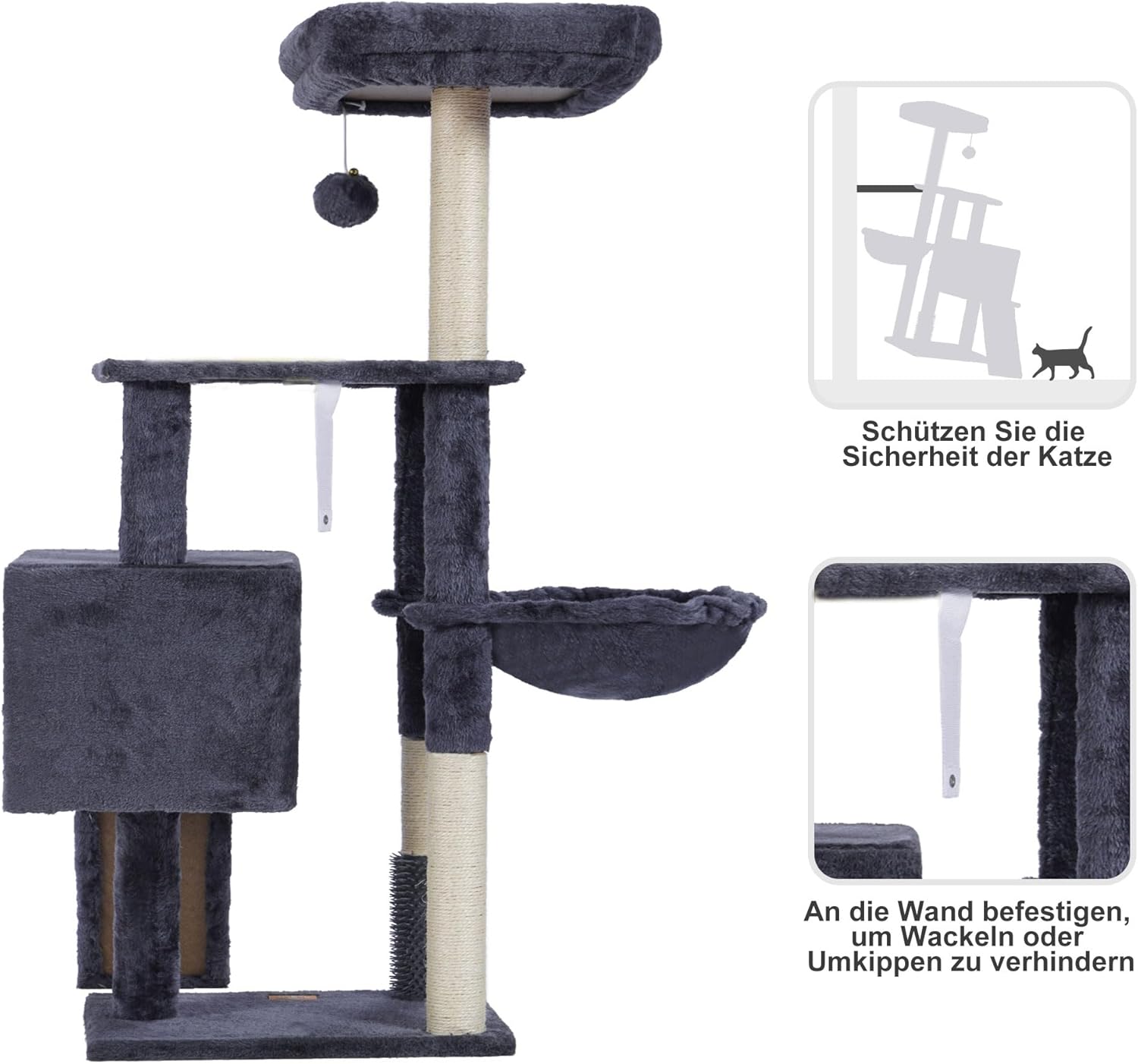 • Четка за самоподстригване на котки: дървото за котки има ниво за самоподстригване. Меката пластмасова четка нежно масажира котката, подхранва я и събира паднала козина. Това е полезно за здравето на котката и поддържа дома ви чист.