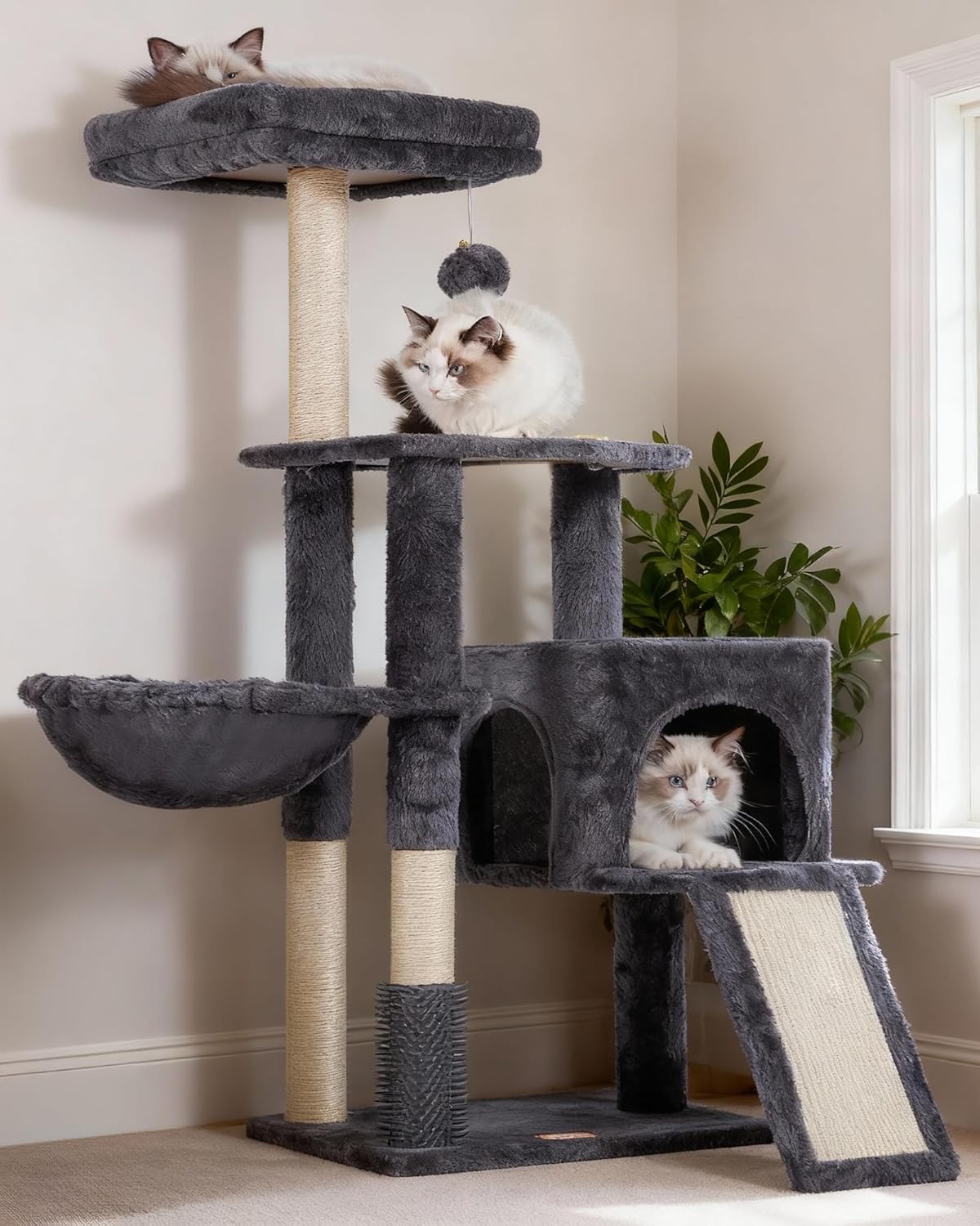 Heybly HCT005SG Драскалка за котки с четка за котки, Дърво за котки за домашни котки с подплатена плюшена кацалка, Драскалка за котки с кошница, Дъска за драскане и Дъска за драскане, Опушено сиво