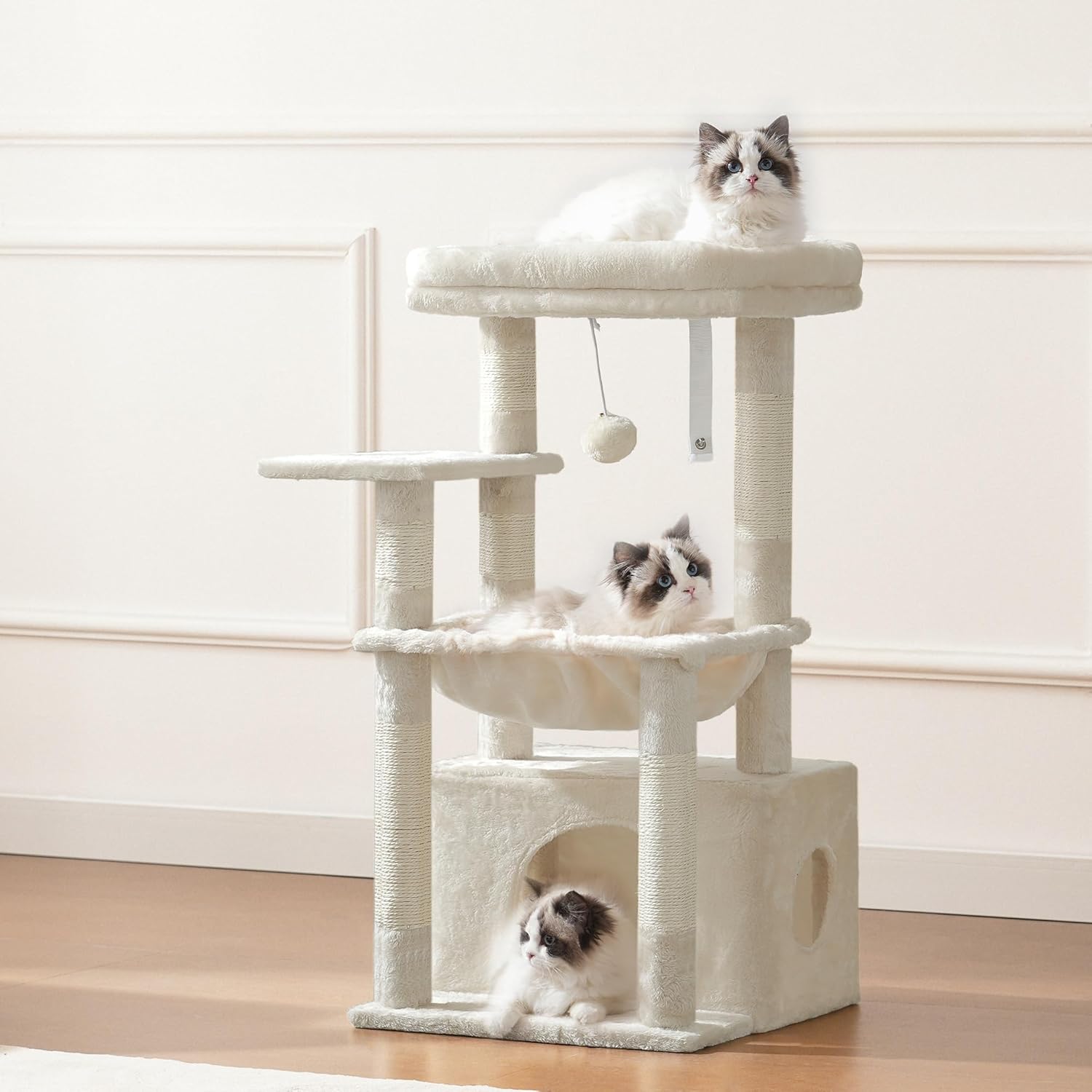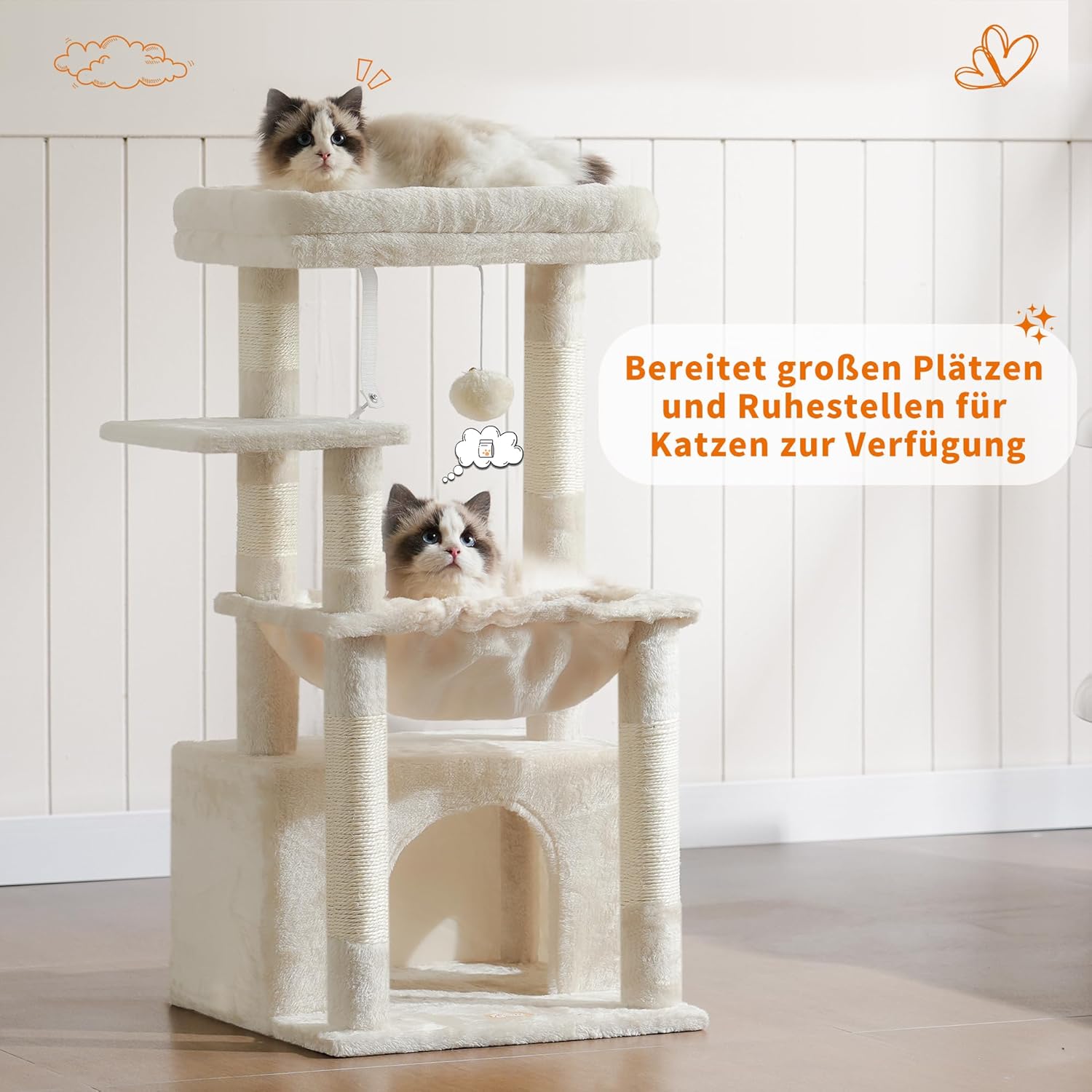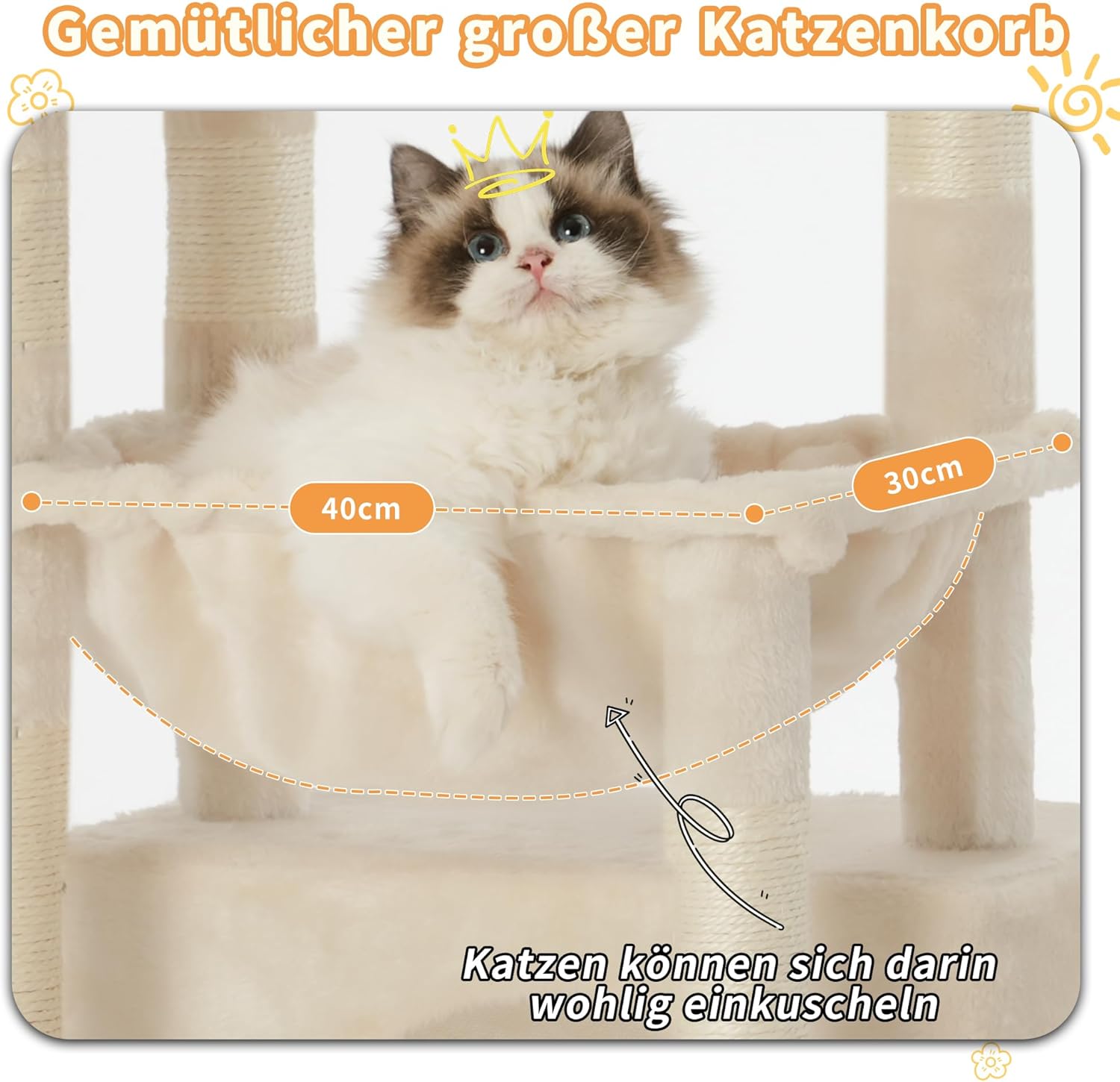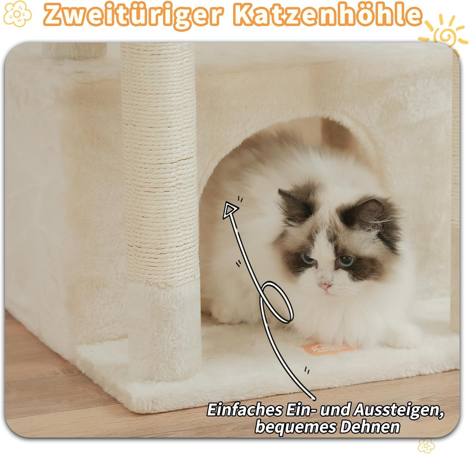 • Платформа за почивка 40 x 30 см: дървото за котки има голяма платформа (40 x 32 см), чиято повърхност е снабдена с дебел слой мека поларена подплата. Висококачественият косъм, подобен на деликатна котешка коприна, придава луксозно усещане и осигурява уютна топлина.